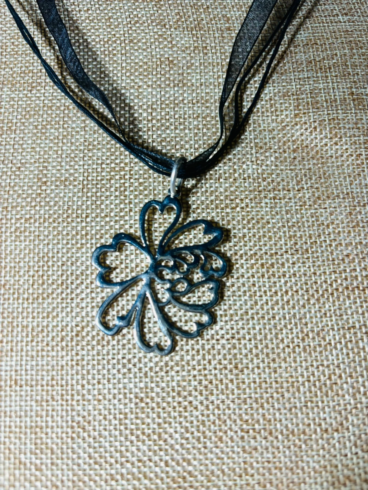 This necklace features a silver flower pendant on a black ribbon. The pendant is a cutout design of a flower with a delicate filigree pattern. The ribbon is a triple strand, creating a layered look. The necklace is perfect for adding a touch of elegance to any outfit.