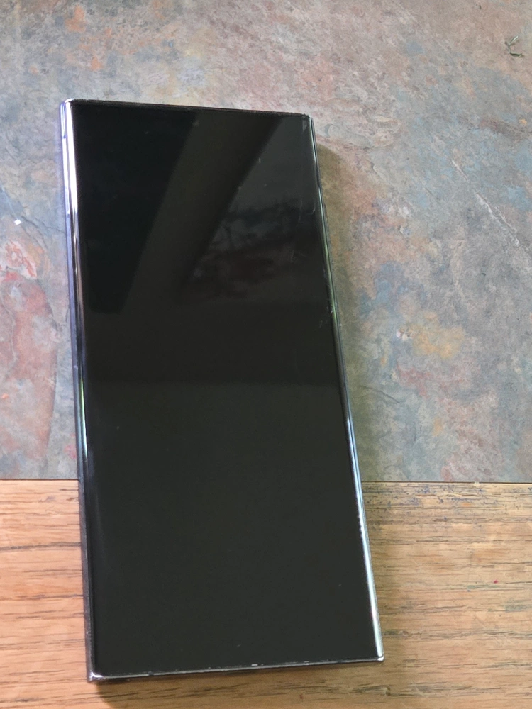 Black Samsung Galaxy Note 20 Ultra. The phone is in good condition. It has a cracked screen and a small scratch on the back. It is still functional and can be used with a screen protector. storage is 256 gb.