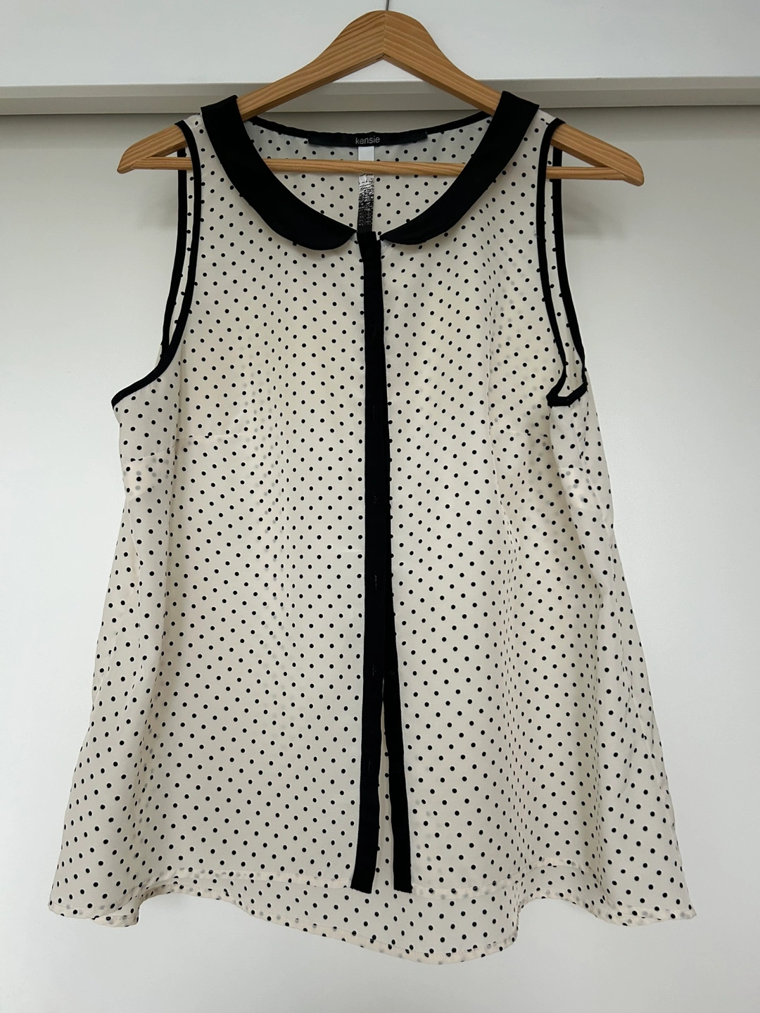 White and black polka dot blouse with a black collar and ribbon tie. Size XL. Sleeveless.