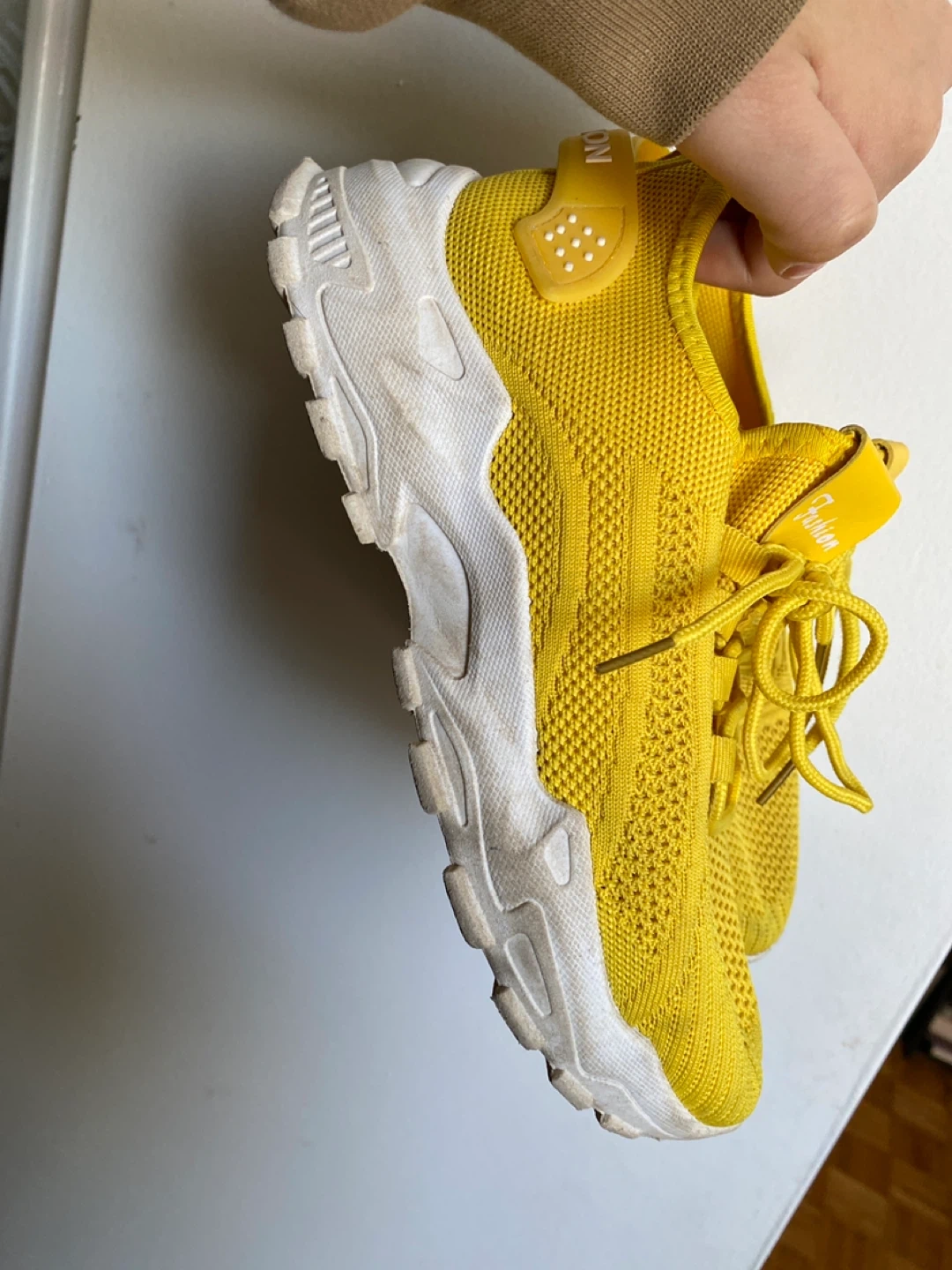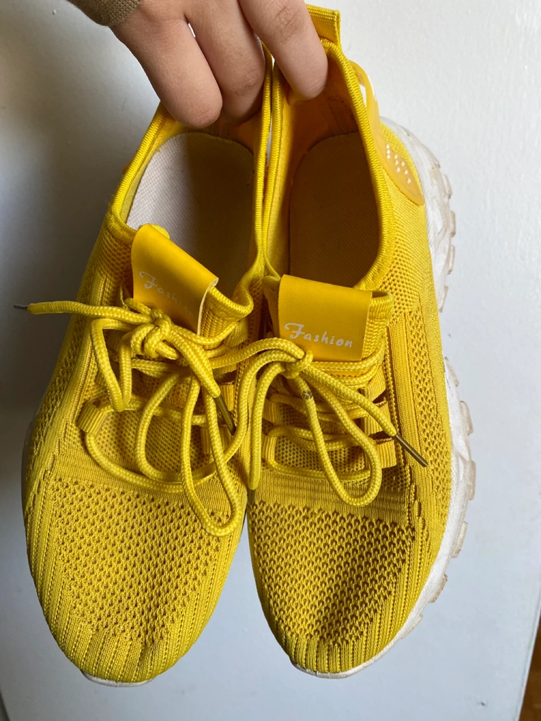 These yellow sneakers have a knitted upper and a chunky white sole. They're lightweight and comfortable for everyday wear. The "Fashion" detail is on the heel strap and tongue.
