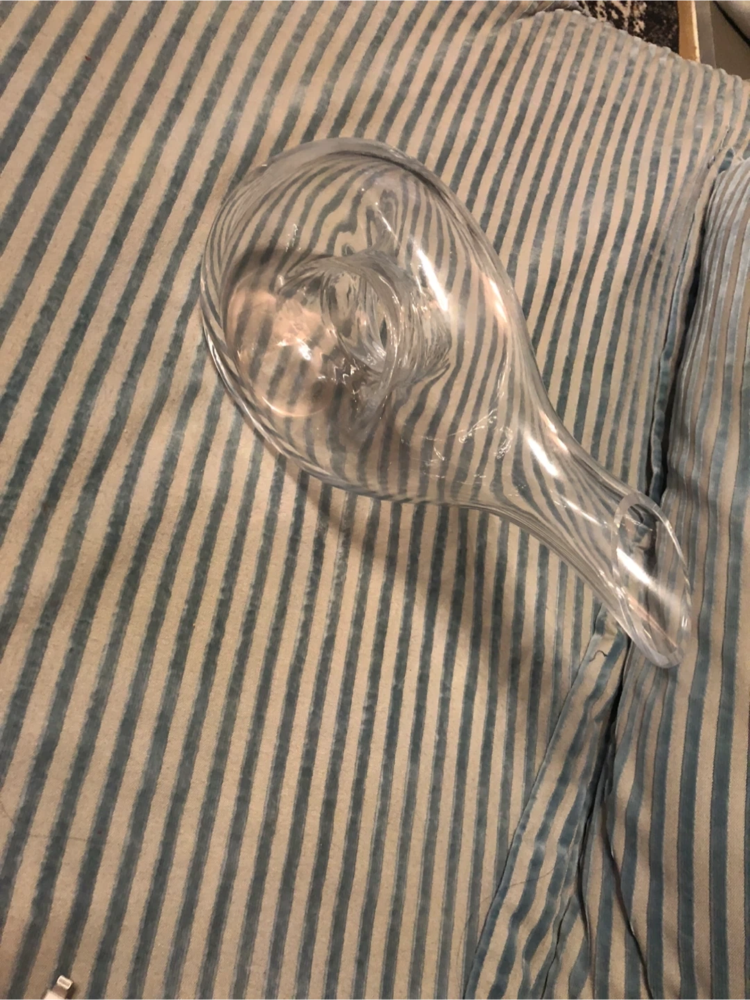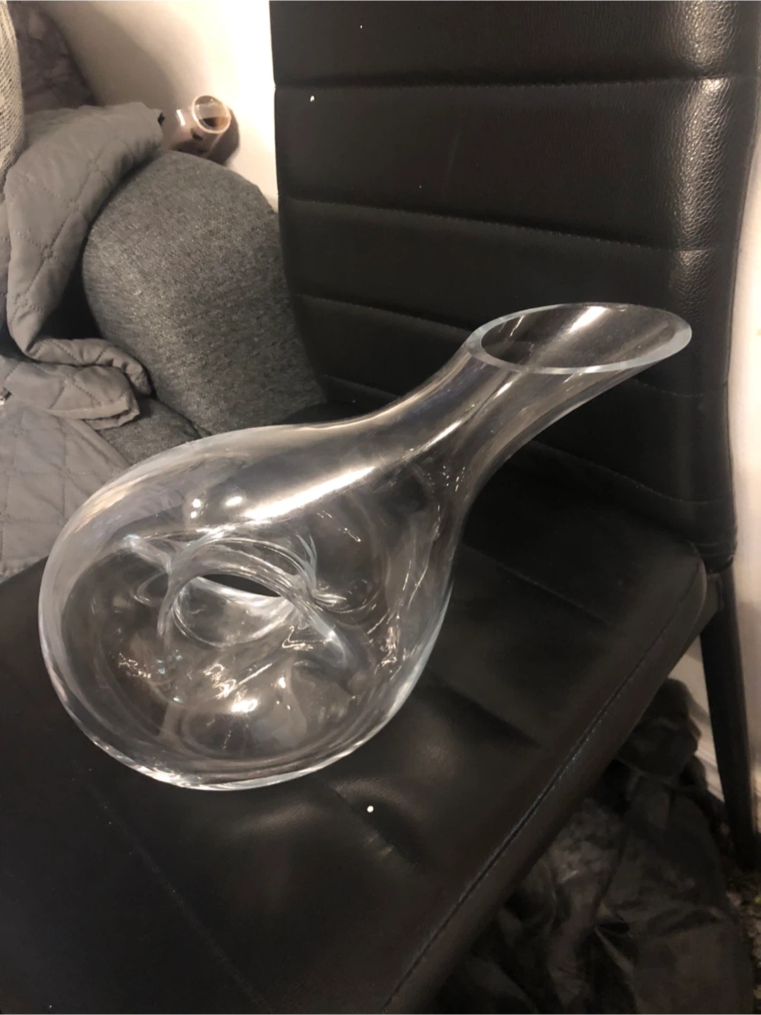 This is a clear glass wine decanter with a unique twisted interior. Its elegant design enhances wine aeration. Perfect for serving guests or enjoying a quiet evening. Made of clear glass.