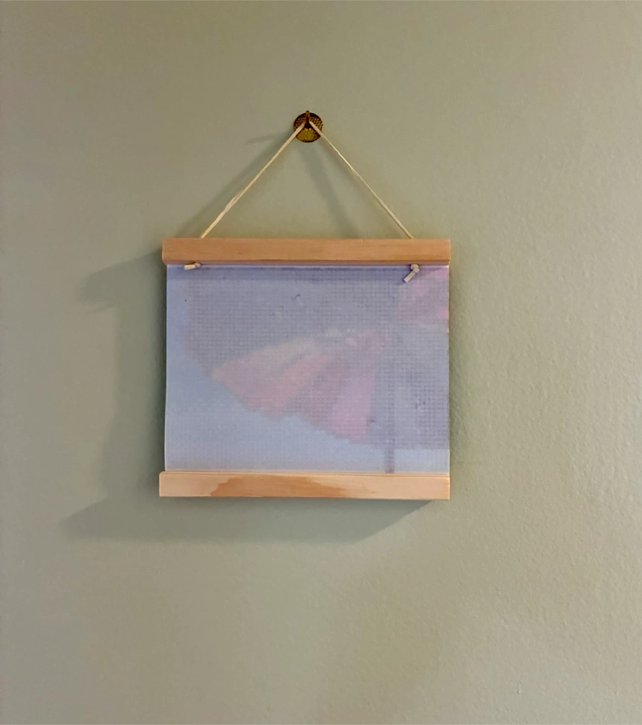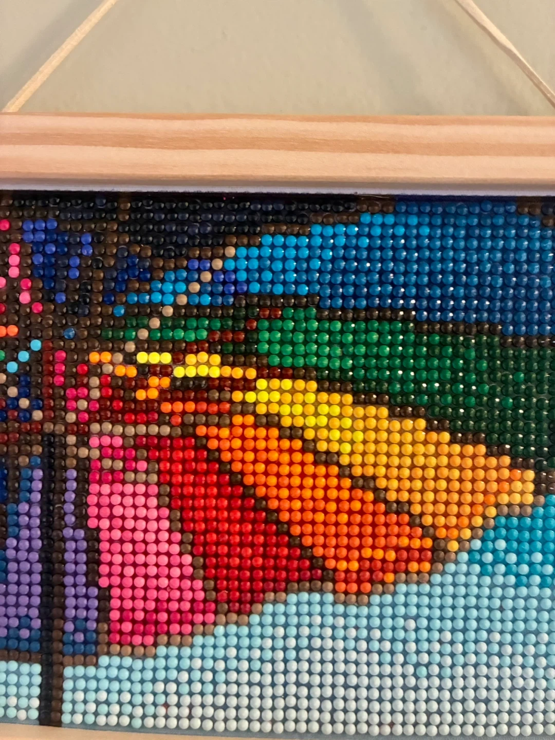 This is a beautiful diamond art painting featuring a colorful design. It comes with a wooden frame and hanging string. The painting is in excellent condition and ready to brighten up any room