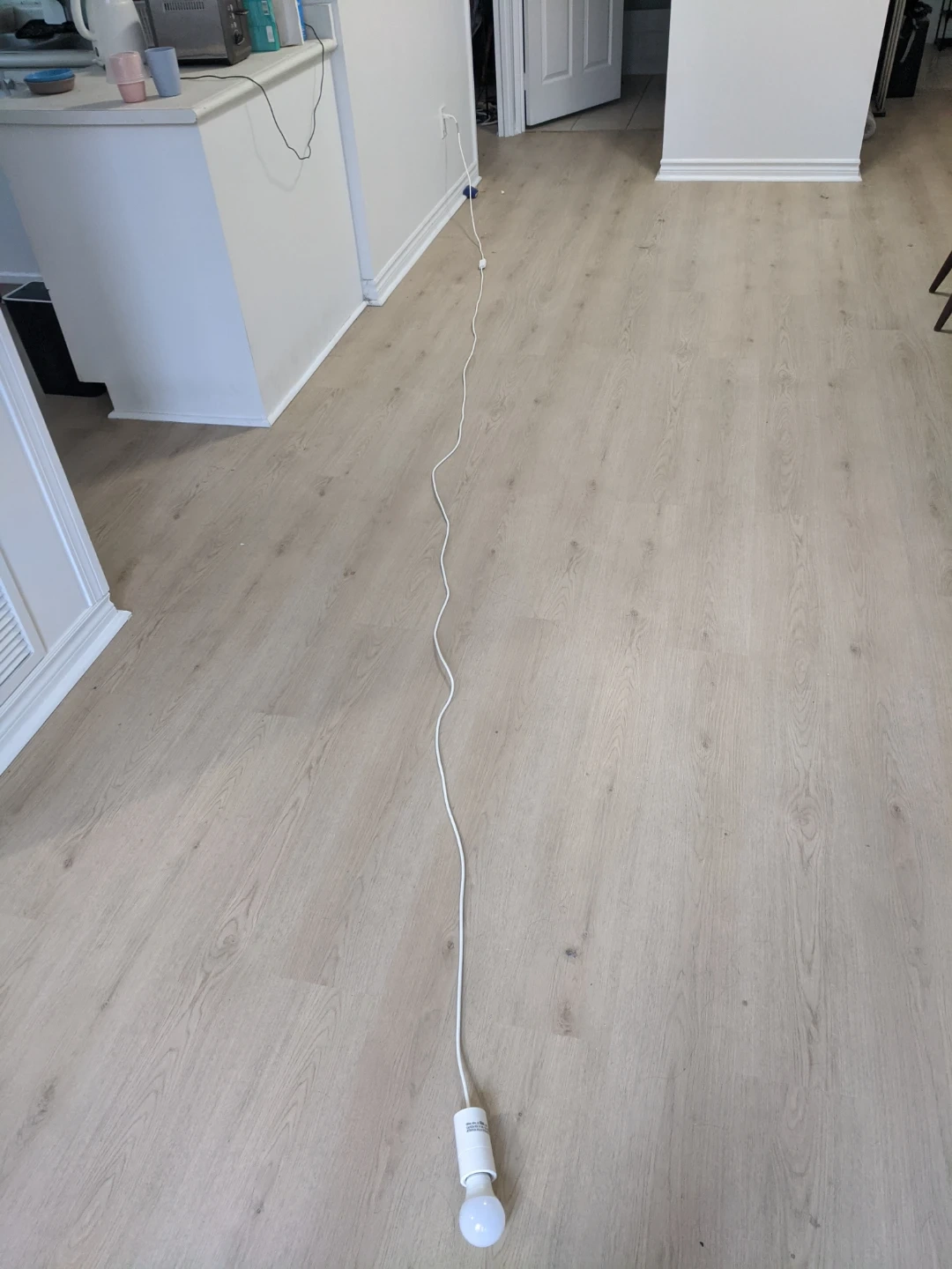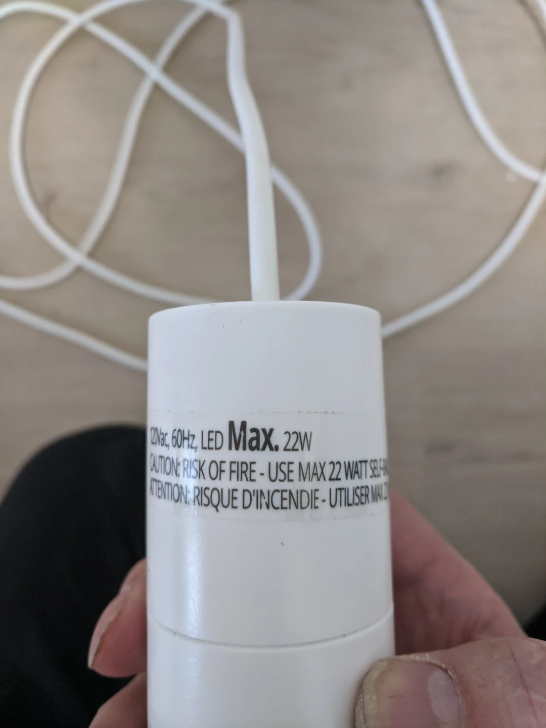 This is a white pendant light cord with an included LED bulb. It's rated for 120V AC, 60Hz and has a maximum wattage of 22W. The cord features an in-line on/off switch. Length is 95". This would be useful for temporary lighting needs or DIY projects. Pick up at 195 Merton Street Toronto or pick up at subway station Davisvill. And I can deliver it to your house but you need to pay me another $3. Thanks.