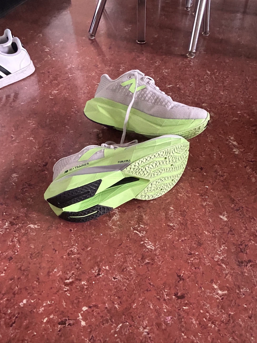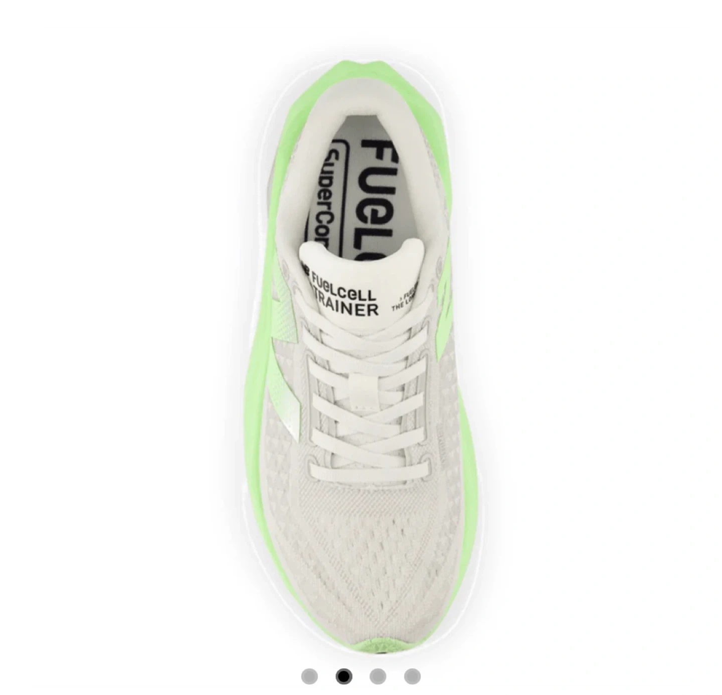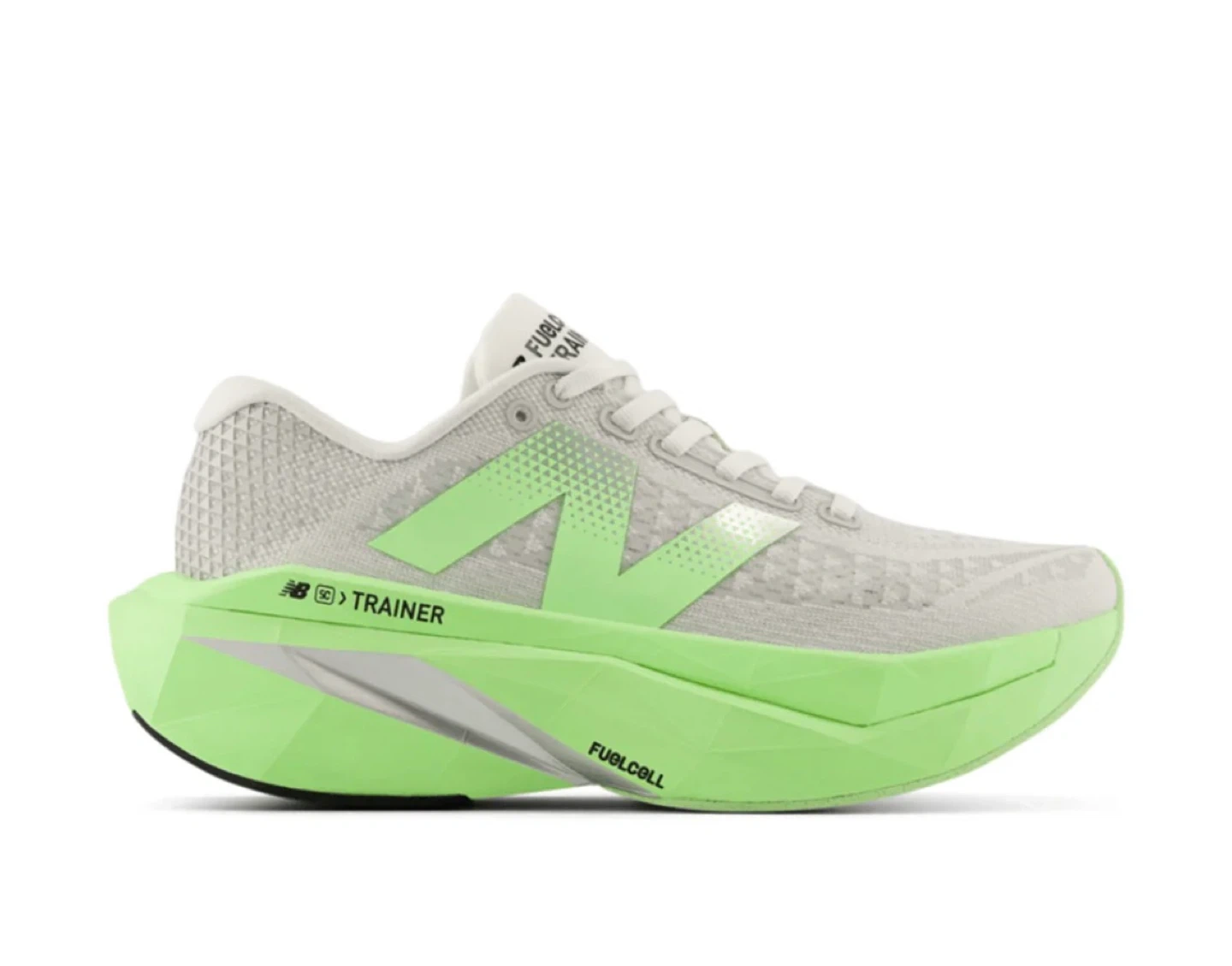 New Balance FuelCell Rebel v2 trainers in a light grey with neon green accents. Features include "Energy Arc" technology and "FuelCell" cushioning. Lace-up closure. Great for road running!