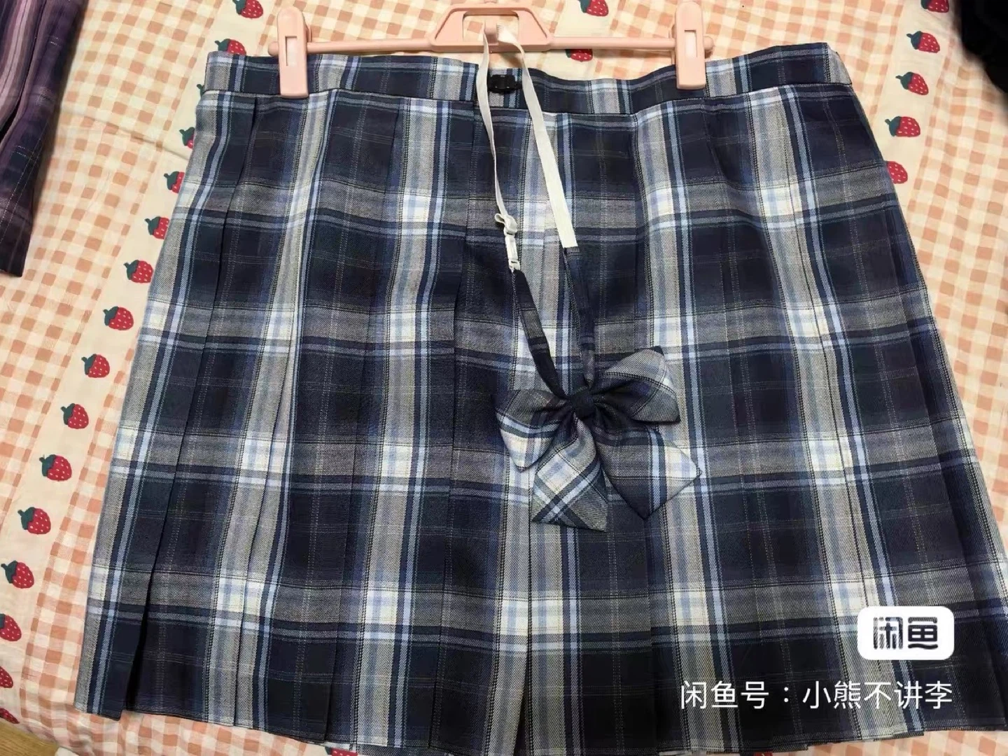 This is a plaid pleated skirt with a detachable bow. It features a classic blue and white plaid pattern and is made of a durable fabric. The skirt's pleats are well-defined and give it a lovely drape.