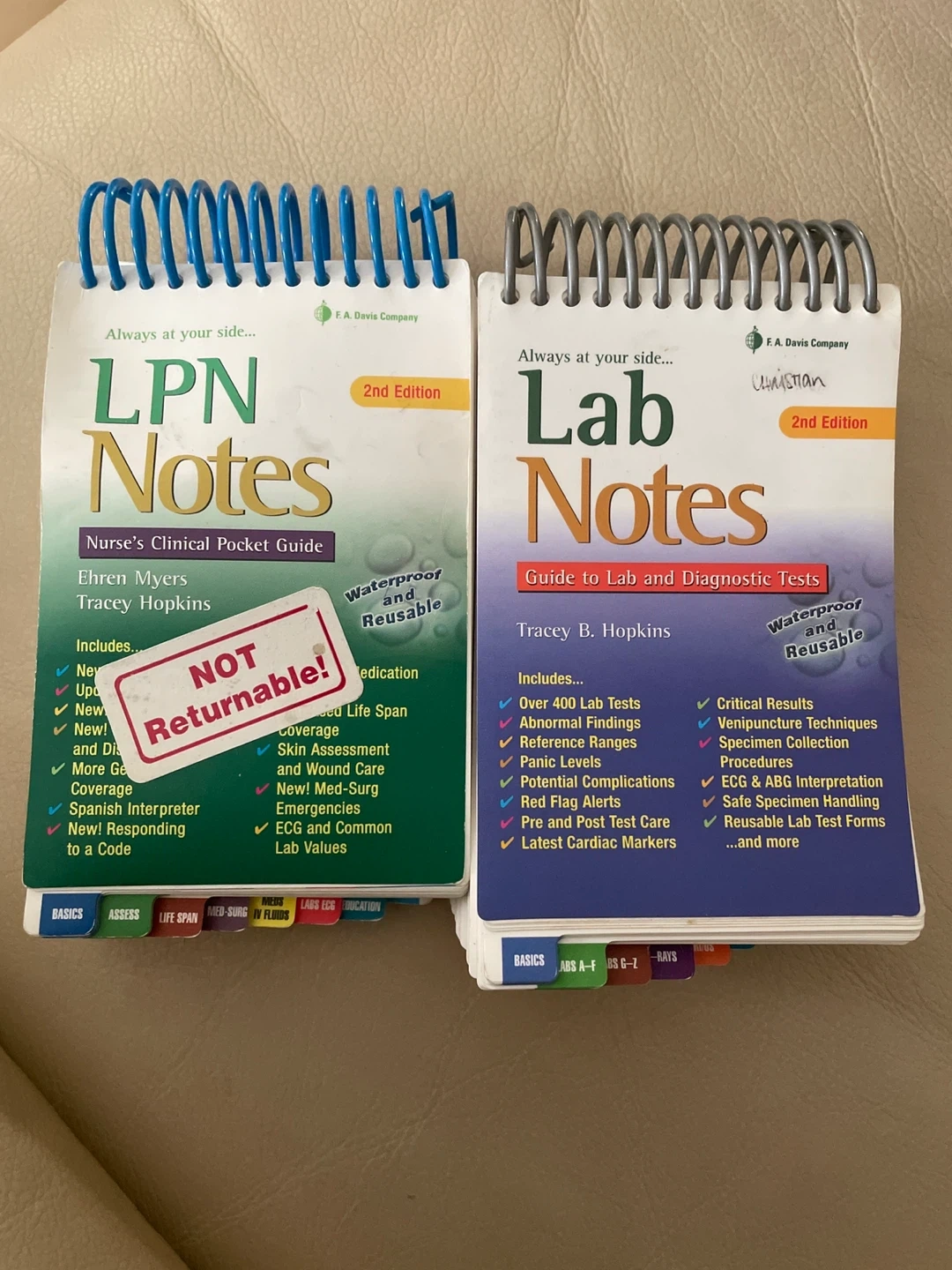 Two waterproof and reusable pocket guides for nurses. Includes LPN Notes: Nurse's Clinical Pocket Guide and Lab Notes: Guide to Lab and Diagnostic Tests. These are 2nd edition guides from F. A. Davis Company. They're great for quick reference in clinical settings.
