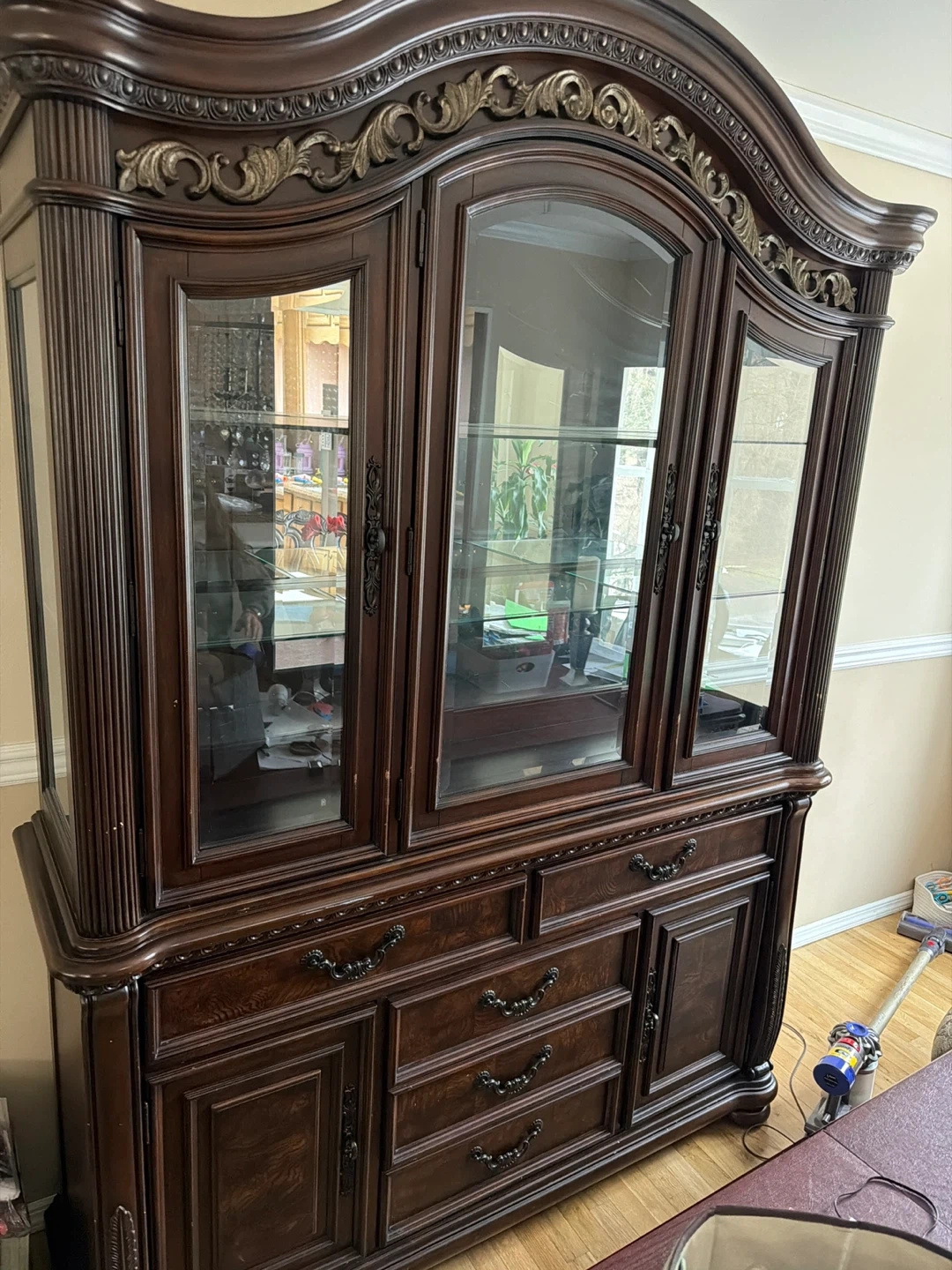 This is a beautiful dark brown wood display cabinet. It features glass doors for showcasing items. It has multiple drawers and cabinets for storage. This piece would be a great addition to any dining room or living area!