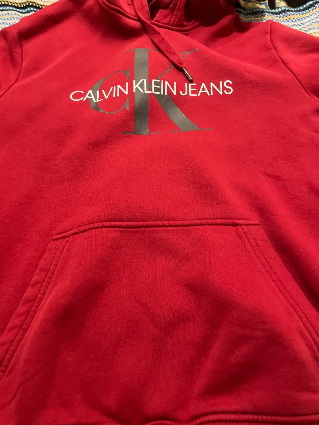 This is a red Calvin Klein Jeans hoodie with a front pocket. It's made of a soft fabric blend, perfect for casual wear. This classic hoodie is great for everyday comfort. In red color. Unisex.