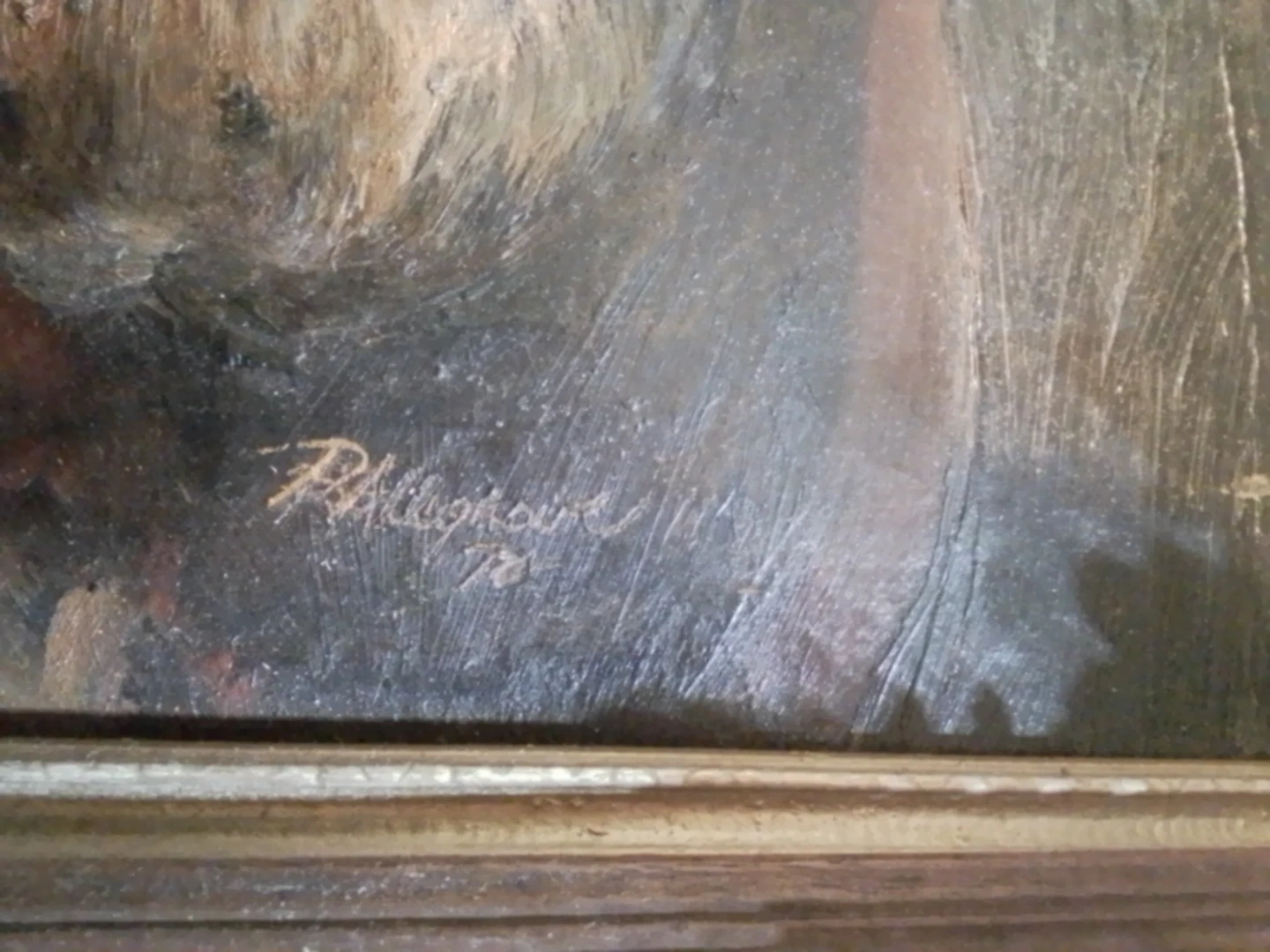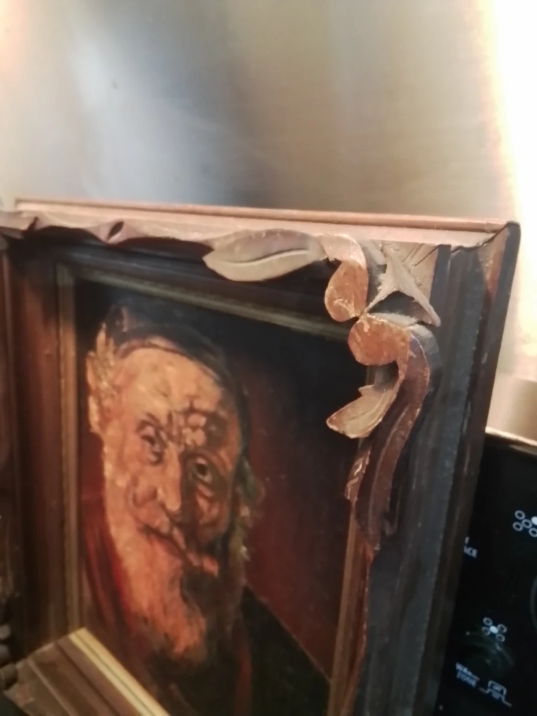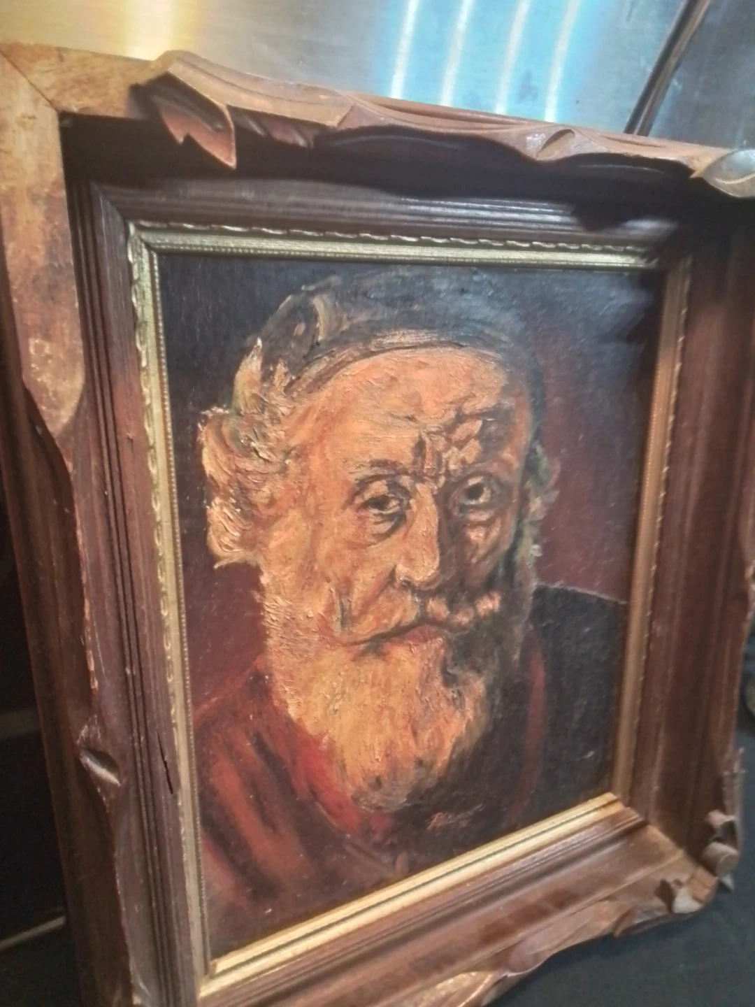 I'm offering a signed oil painting of a brilliant man, created in the '70s. The painting is in used condition and features a detailed portrait with a unique artistic style. The frame has some damage in the corners but does not detract from the overall viewing experience of this art piece. It measures 12.25 inches by 14.25 inches, making it a great addition to any art collection.