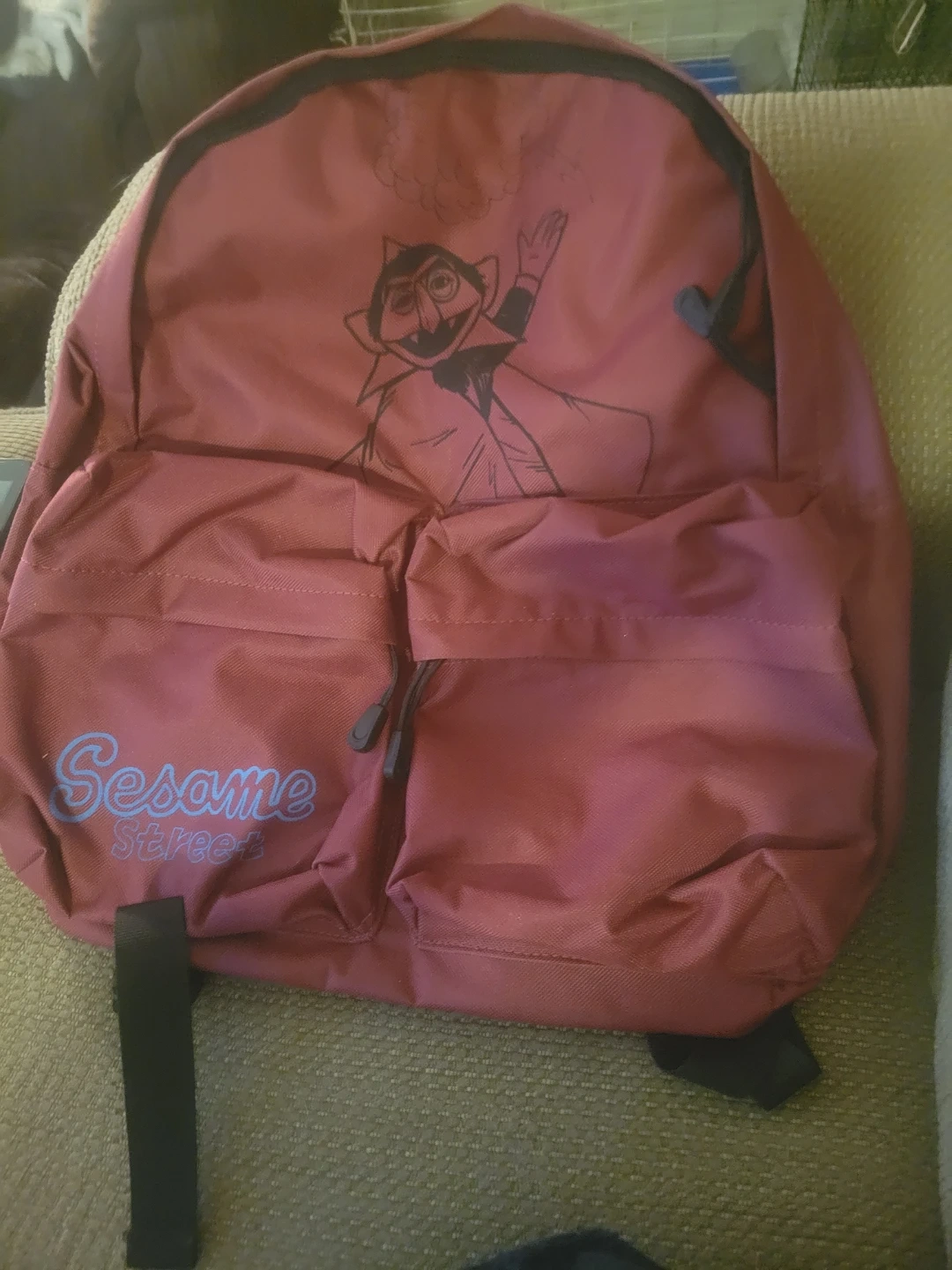 A fun burgundy backpack with the Count from Sesame Street on the front. It has two front pockets with zippers. Great for kids heading to school or on an adventure!