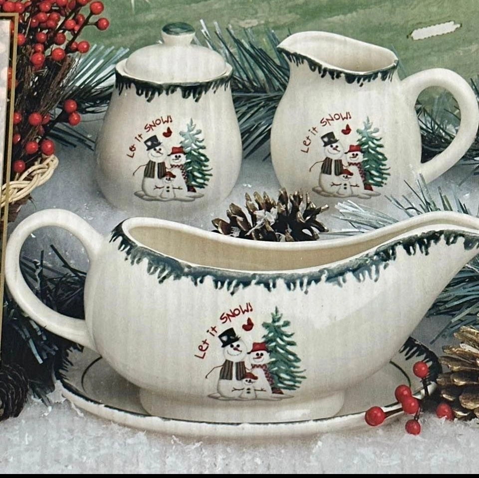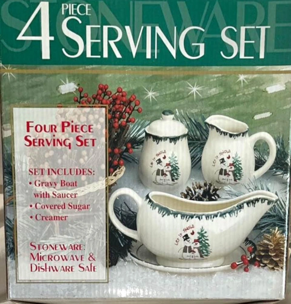 Let It Snow! 4 Piece Stoneware Serving Set from ATICO International. Brand new, never been used or opened. Vintage American style. Makes a great Holiday set or addition to one already.