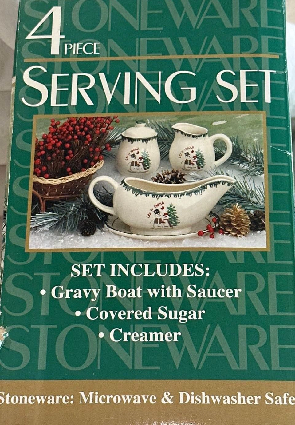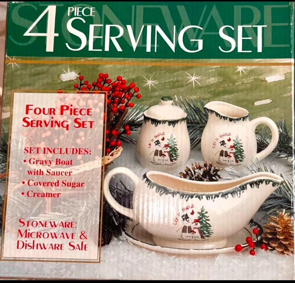 Let It Snow! 4 Piece Stoneware Serving Set from ATICO International. Brand new, never been used or opened. Vintage American style. Makes a great Holiday set or addition to one already.