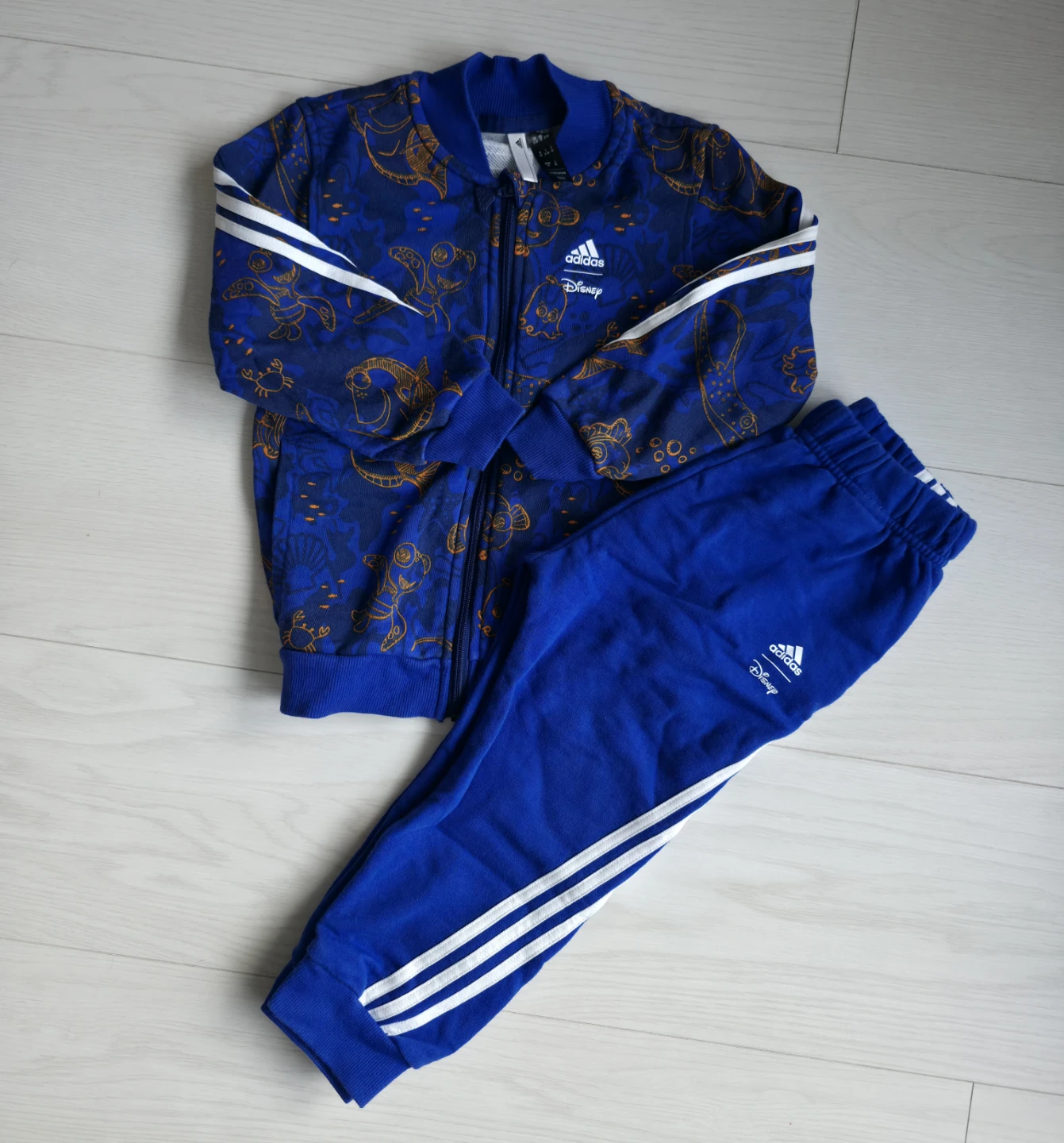 Selling a cute Adidas tracksuit featuring a Disney design! The size is 2-3 years (98 cm). The tracksuit is blue with white stripes on the sleeves and pants. It's in great condition and ready for a new adventure!