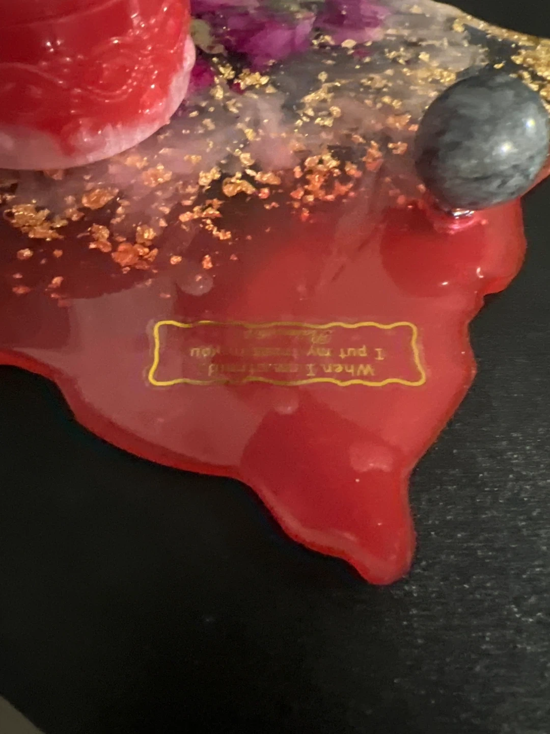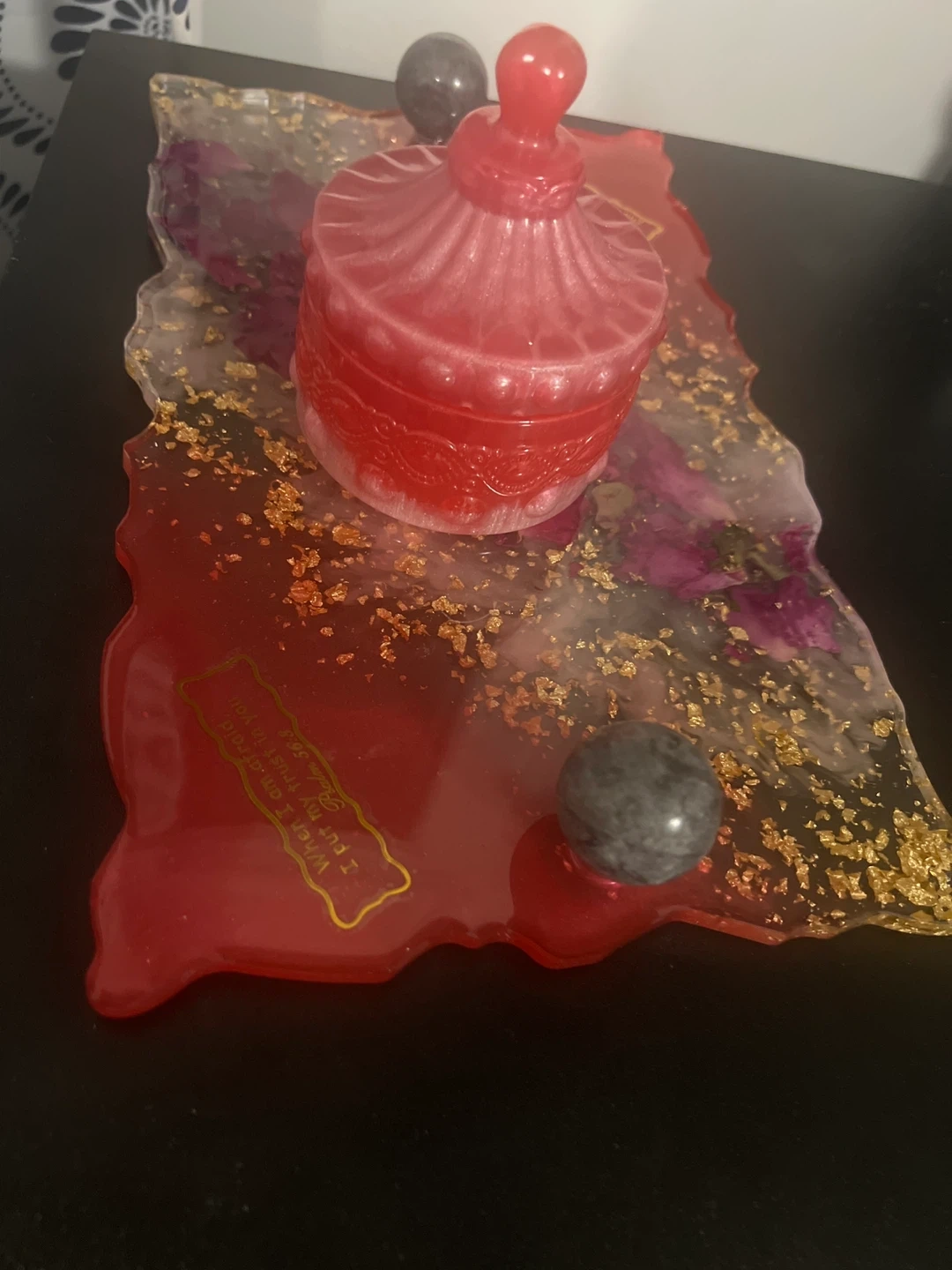 Beautiful handmade resin trinket dish with a decorative lid. Features dried flowers and gold flakes embedded within the red resin. Includes a small inspirational quote on the dish. Perfect for storing small jewellery or trinkets!