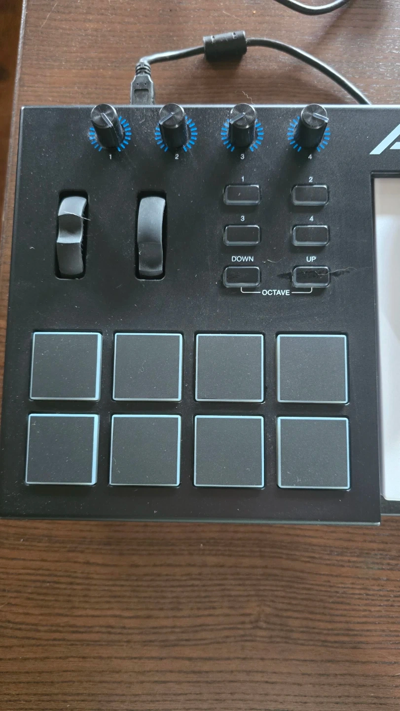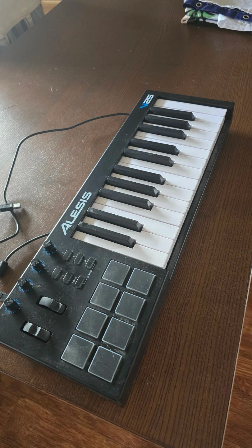 This is an Alesis V25 USB MIDI controller. It's got four assignable knobs and eight velocity-sensitive pads for your beats. It also includes pitch and modulation wheels, plus octave up/down buttons.
