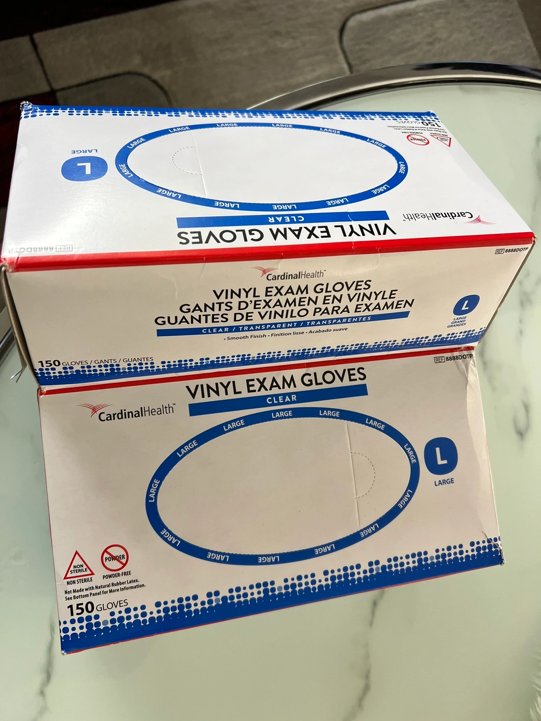 One box of vinyl exam gloves, clear, size large. Each box contains 150 gloves. Powder-free. Non-sterile.