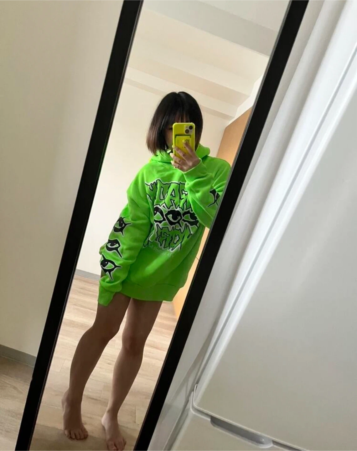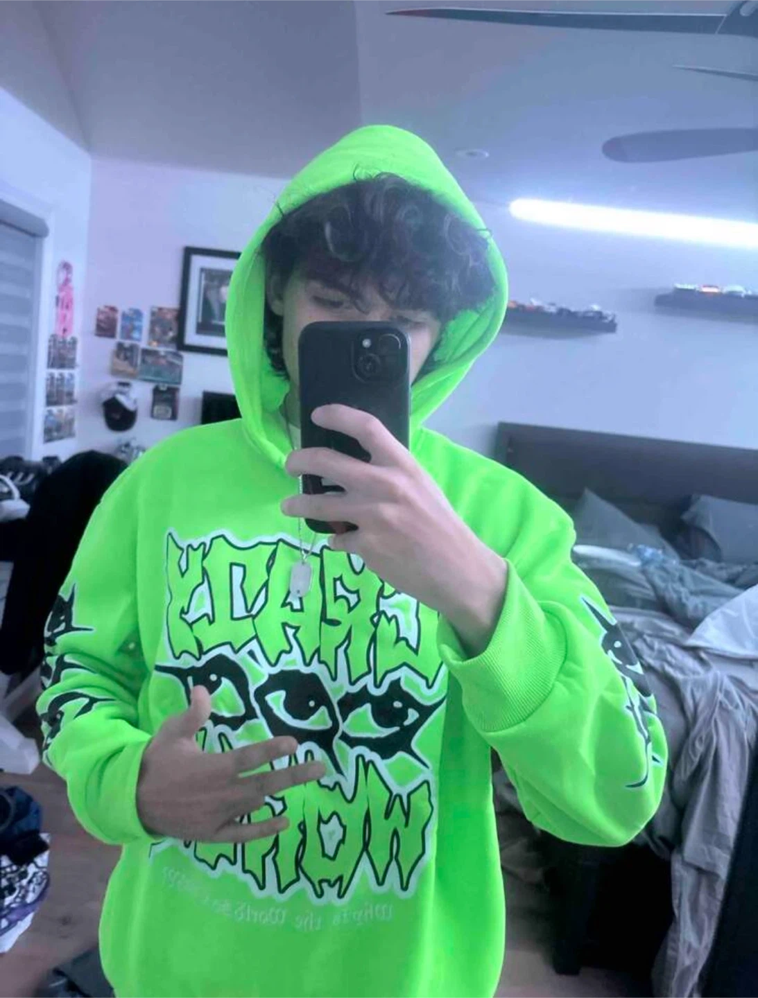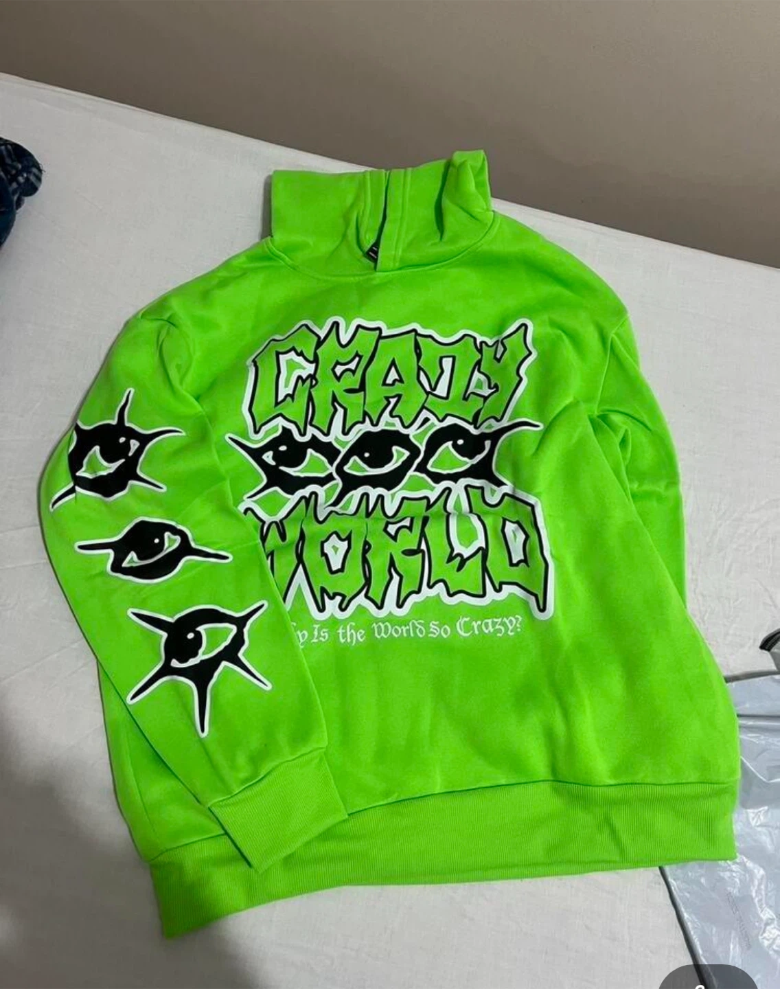 Selling a vibrant neon green hoodie with a bold "Crazy World" graphic. It's in great condition and features eye-catching designs on the sleeves. Perfect for making a statement!