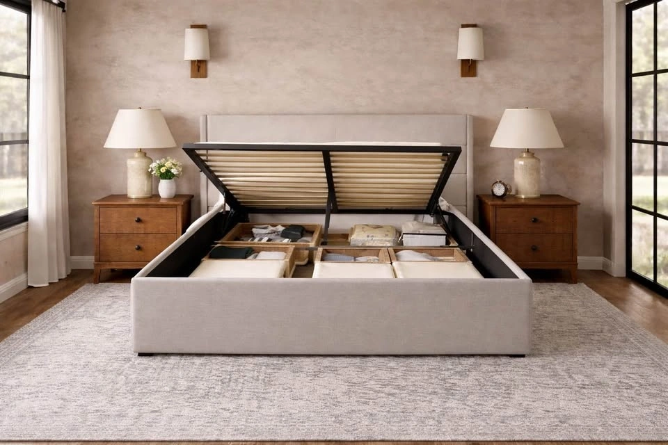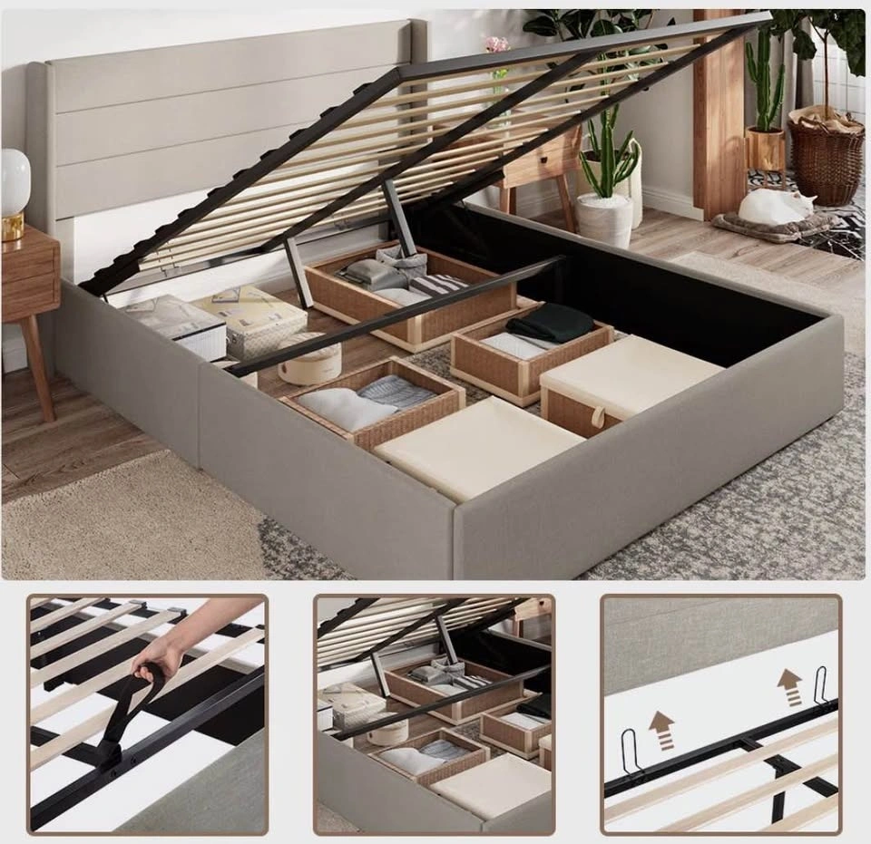 Upgrade your bedroom with this modern double/full-size hydraulic lift storage bed in a stylish greige colour. Features a smooth gas-lift mechanism that opens easily to reveal large hidden storage space—perfect for condos or smaller bedrooms.