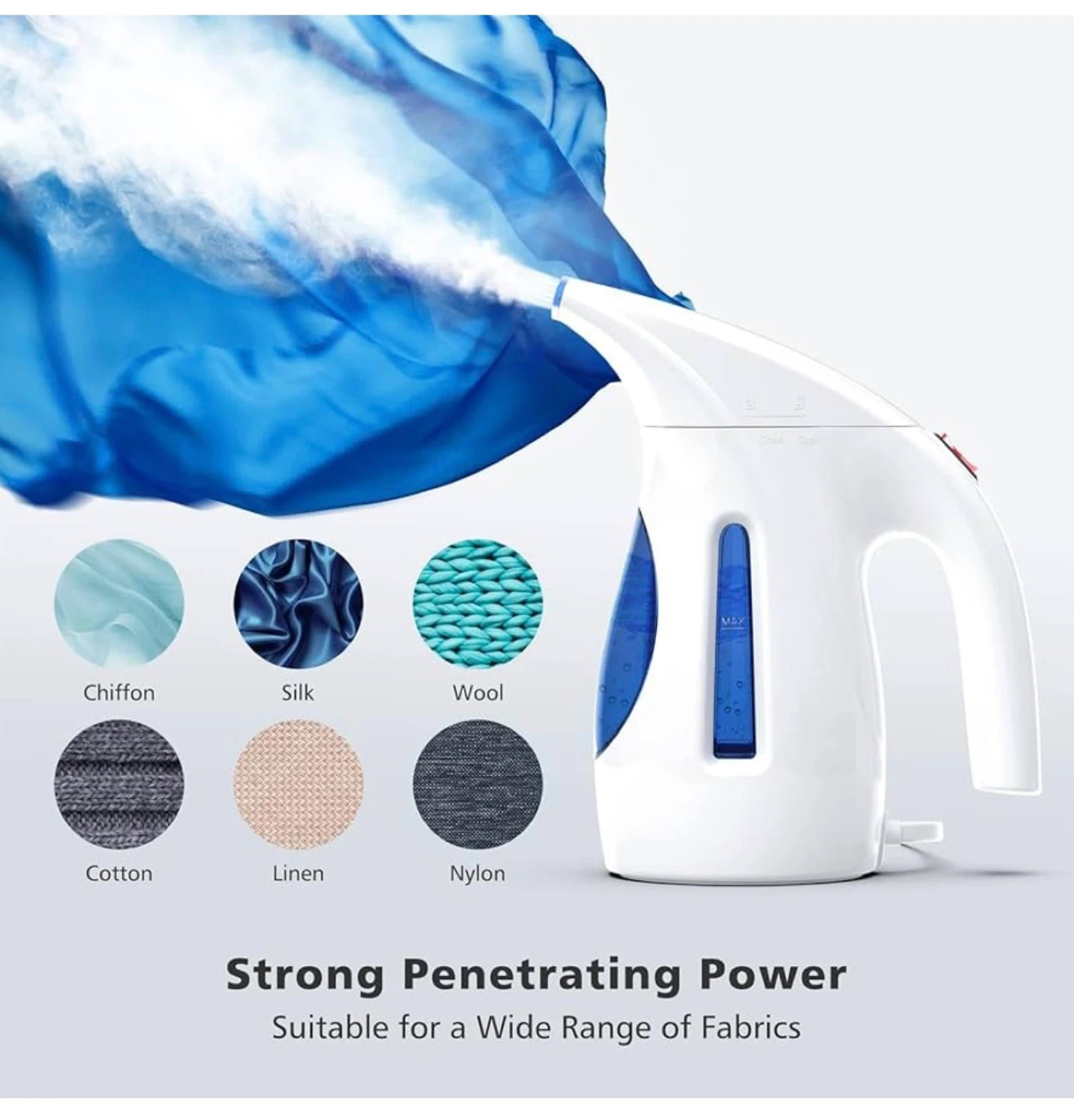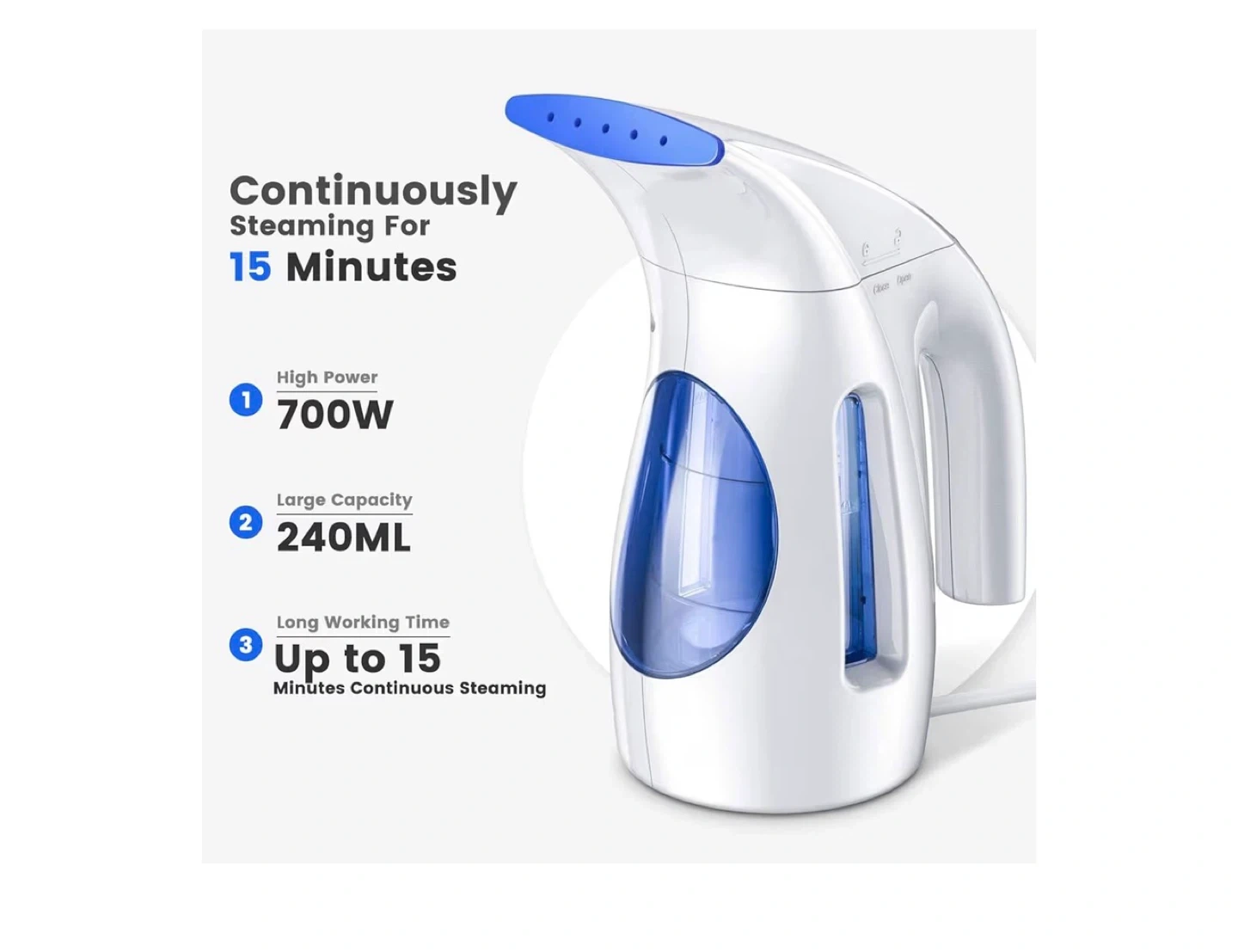 [Large Tank] It has a water-holding capacity of 240 ml and can provide up to 15 minutes of continuous steaming to eliminate wrinkles flawlessly. Note: Do not add the water over the MAX line to avoid spraying
