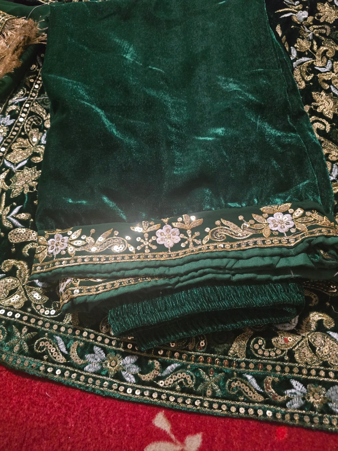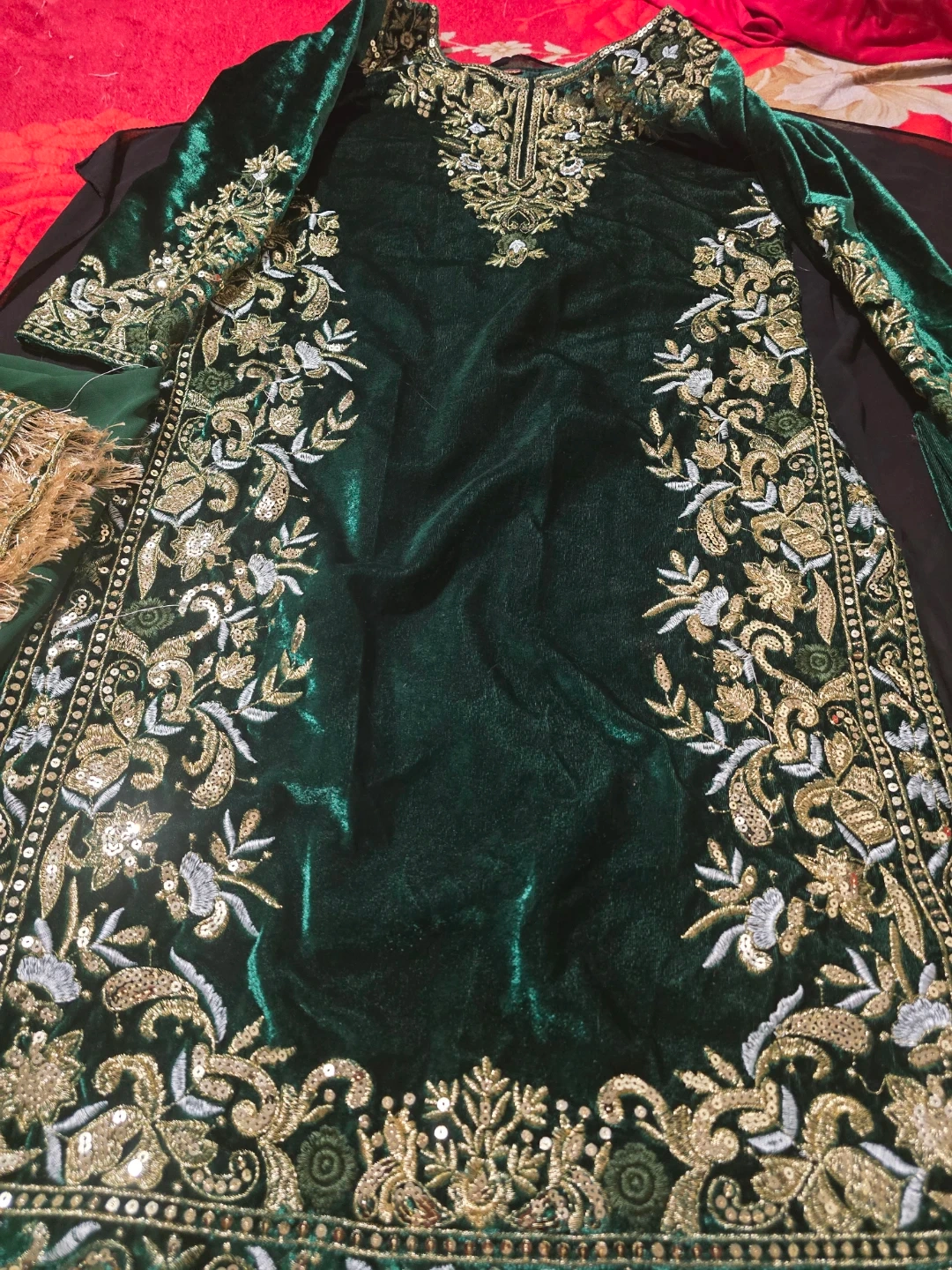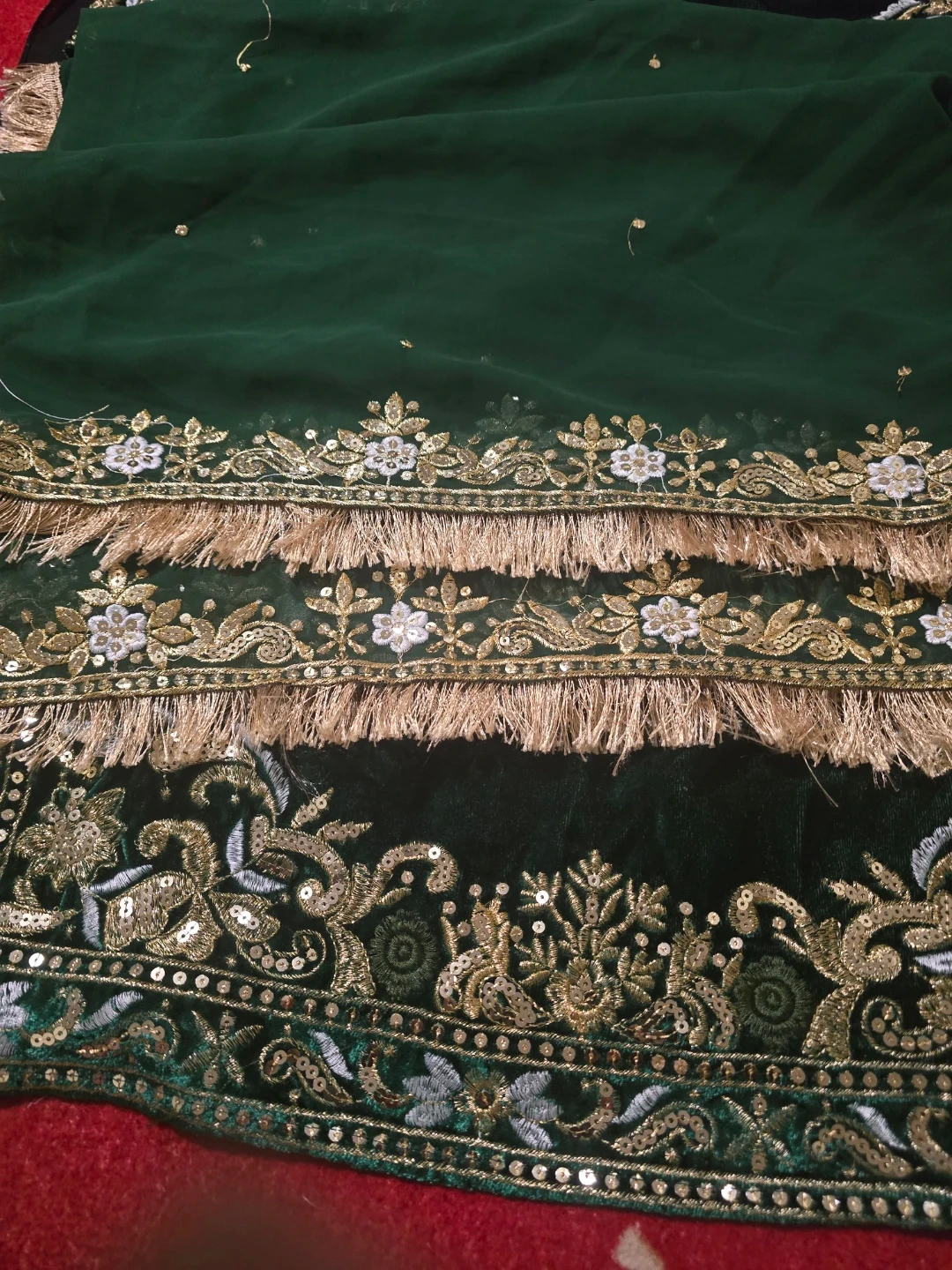 This is a beautiful stunning green velvet dress set with intricate gold and silver embroidery. It comes with a matching embroidered dupatta featuring fringe details. The outfit is embellished with sequins and floral patterns. Perfect for festive occasions or formal wear! And its been wore for once.