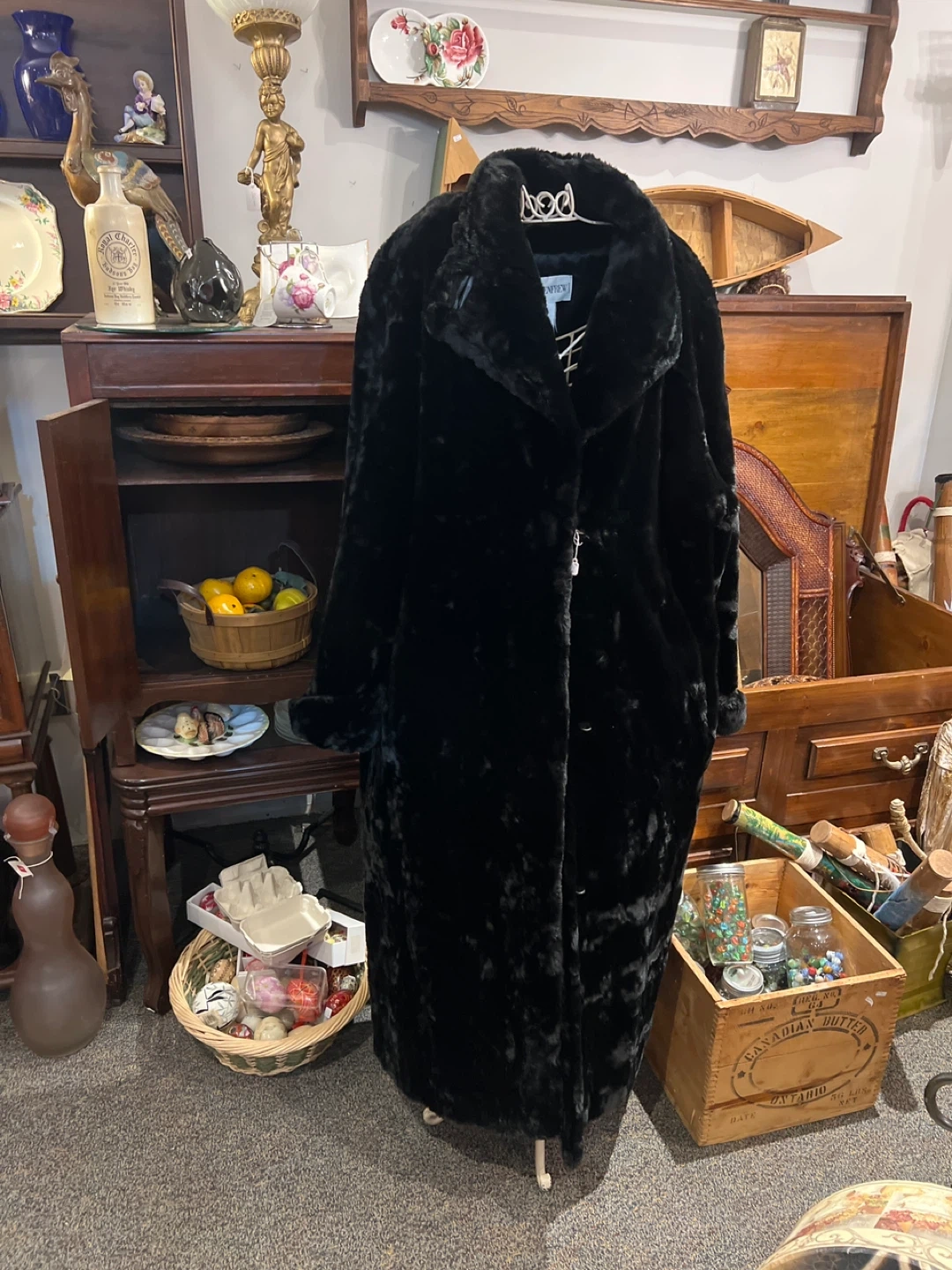 This long, black faux fur coat is super soft and warm. It's a stylish outerwear piece for colder weather. The coat has a classic collar and button closure.