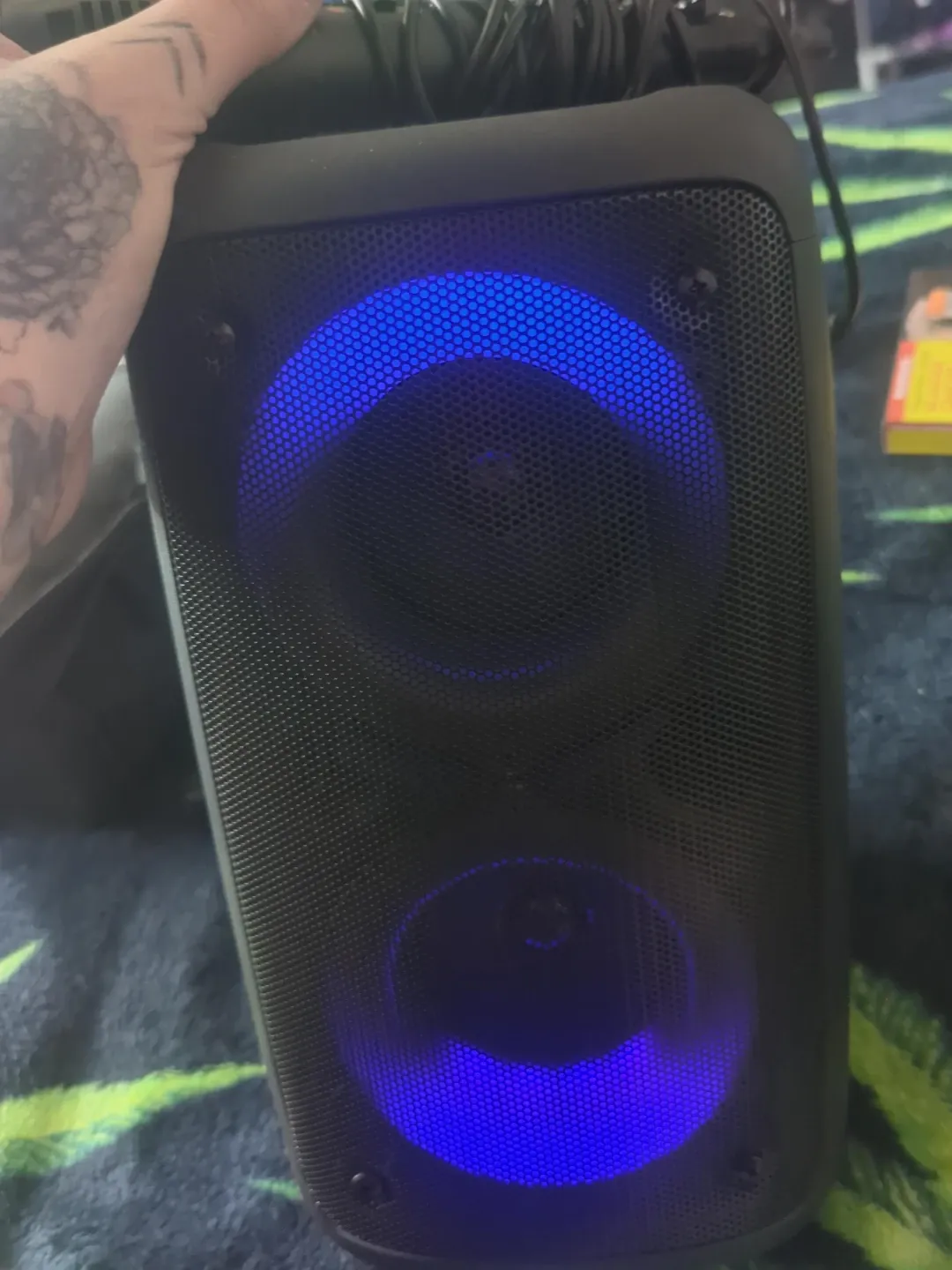 This portable speaker has blue LED lights. It's a black, rectangular speaker with two drivers. Great for parties! Comes with microphone as well karaoke machine