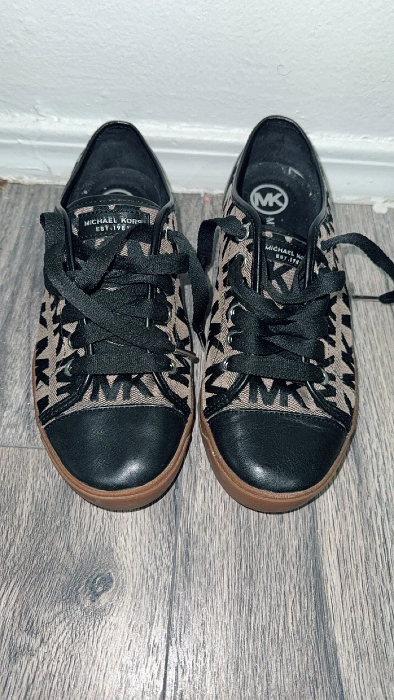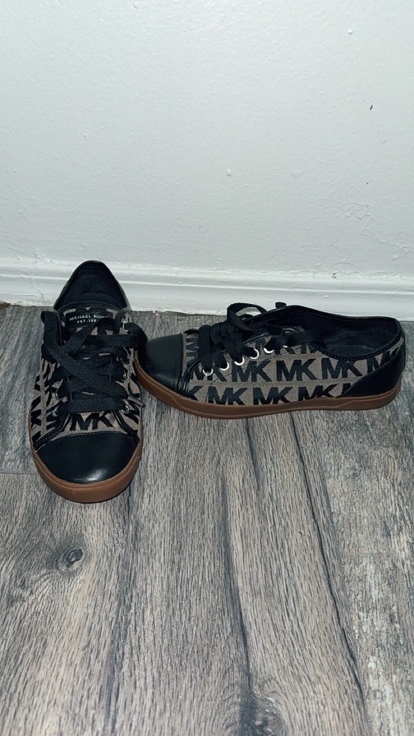 Michael Kors canvas sneakers with allover MK logo print. Features black leather trim and toe cap. Rubber sole.