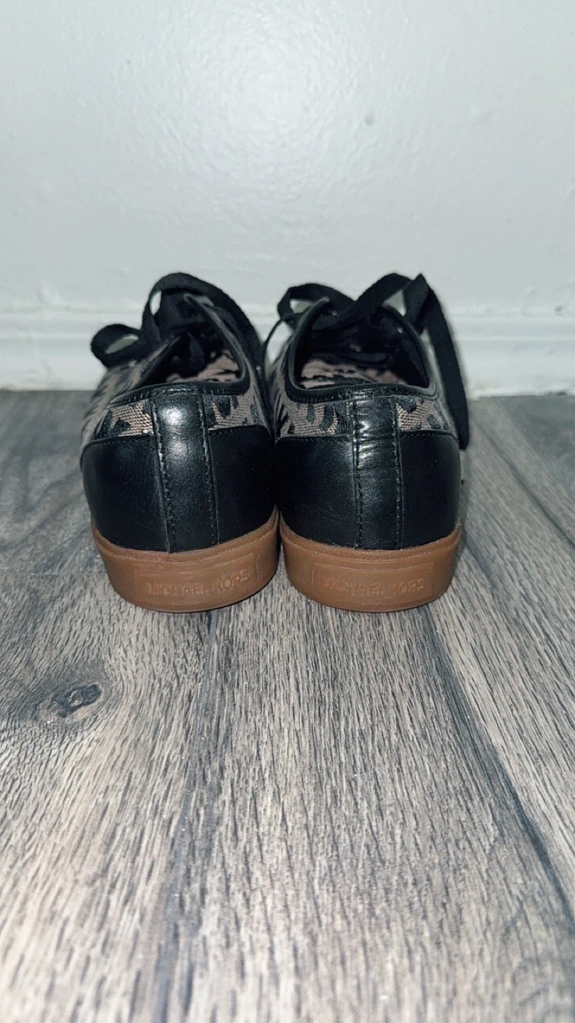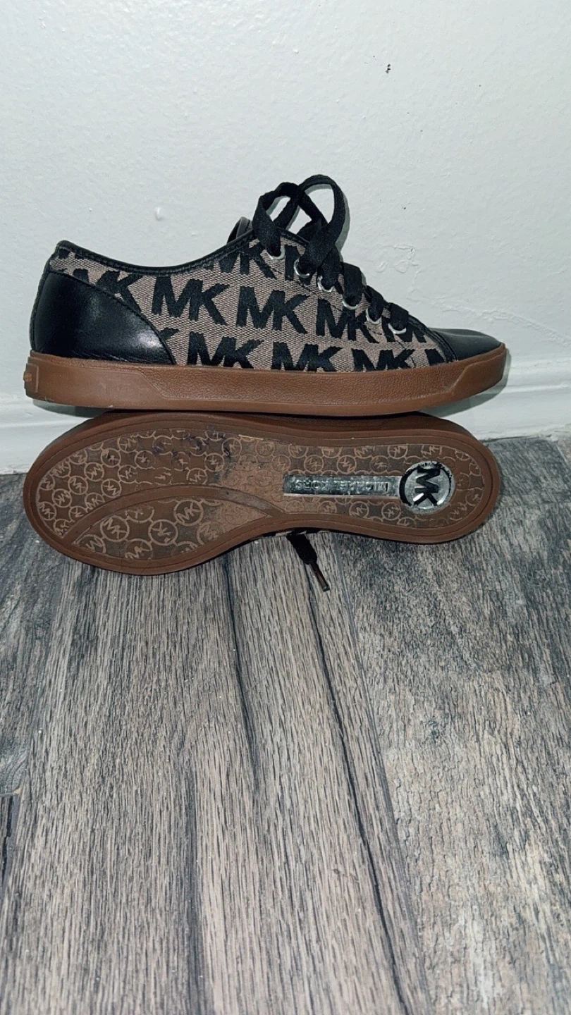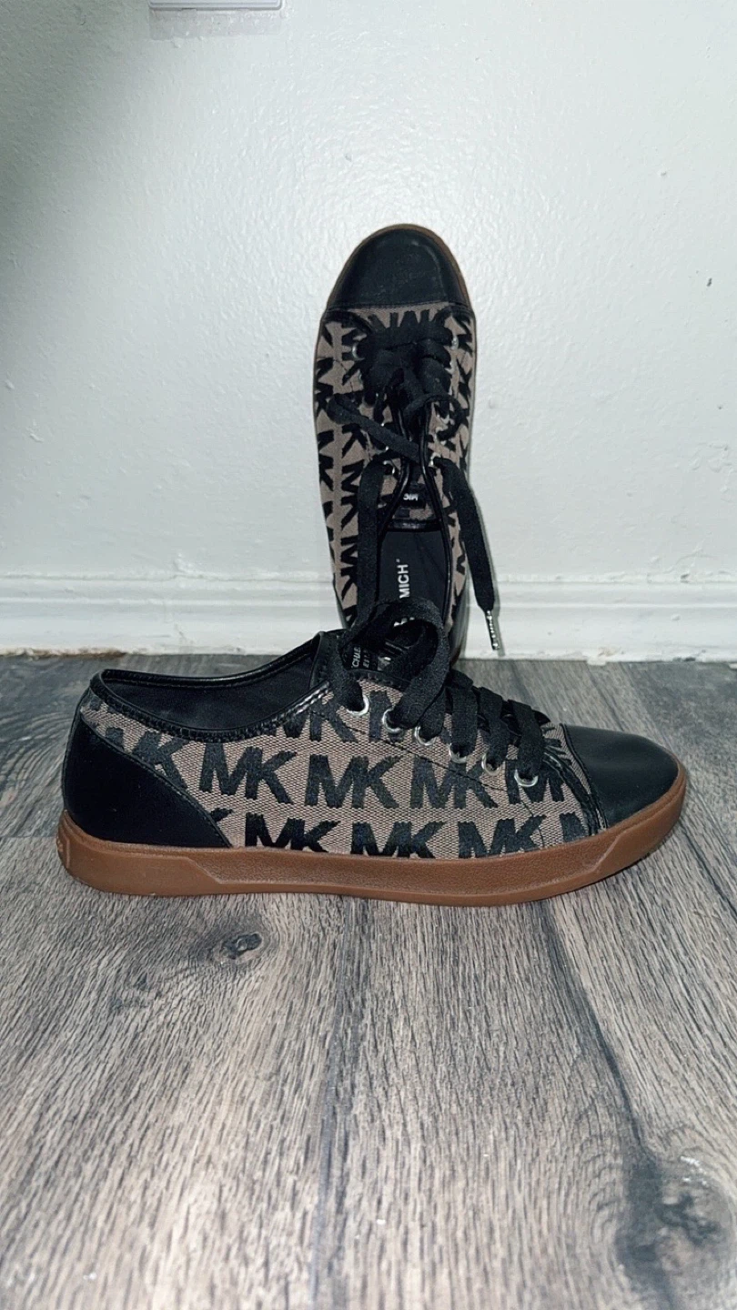 Michael Kors canvas sneakers with allover MK logo print. Features black leather trim and toe cap. Rubber sole.