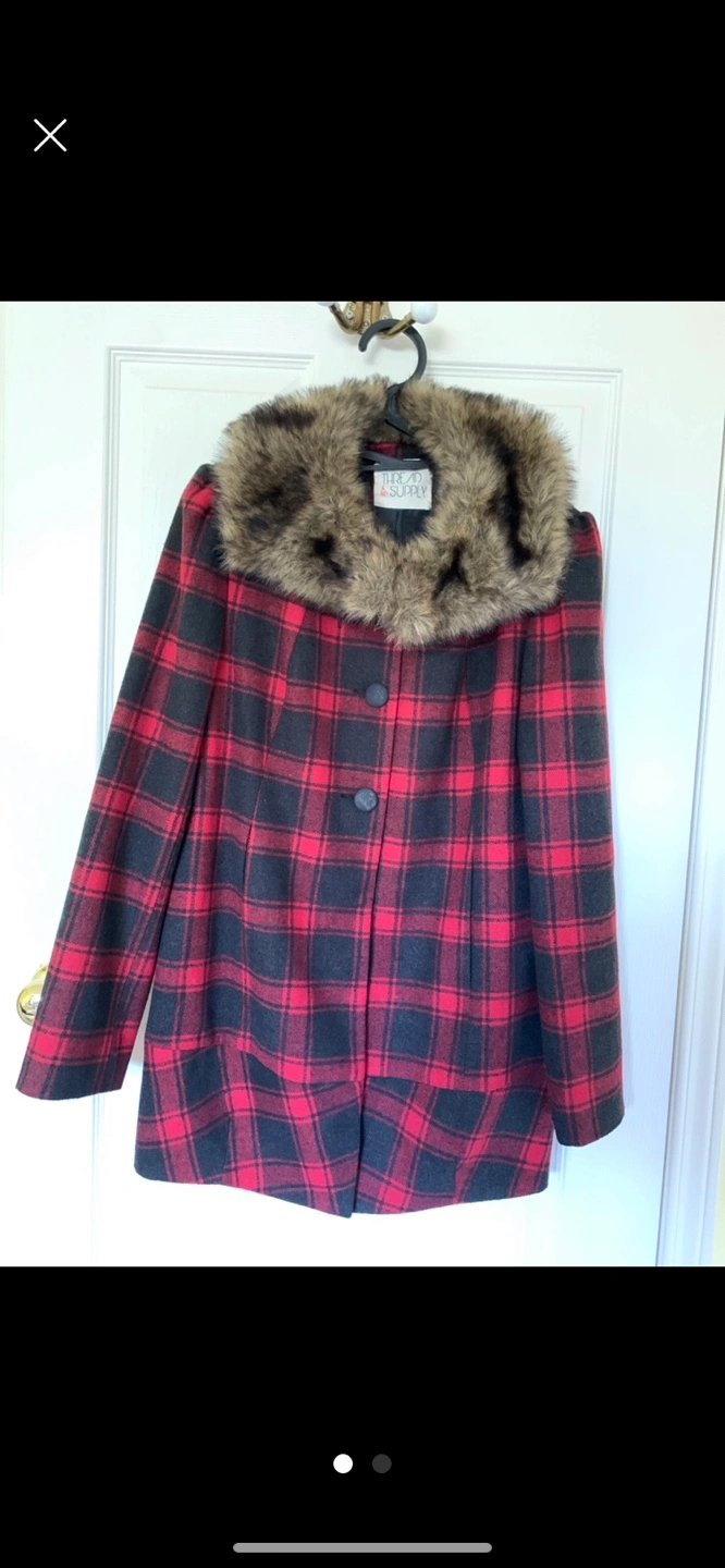 Red and Black Plaid wool Coat with Faux Fur Collar. New