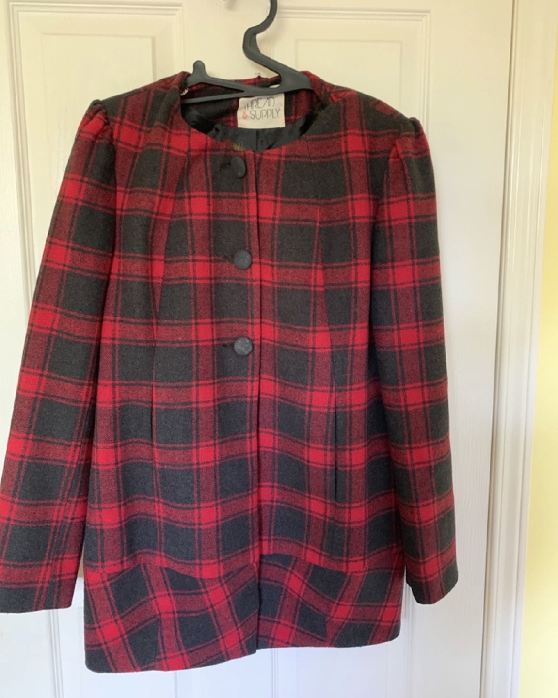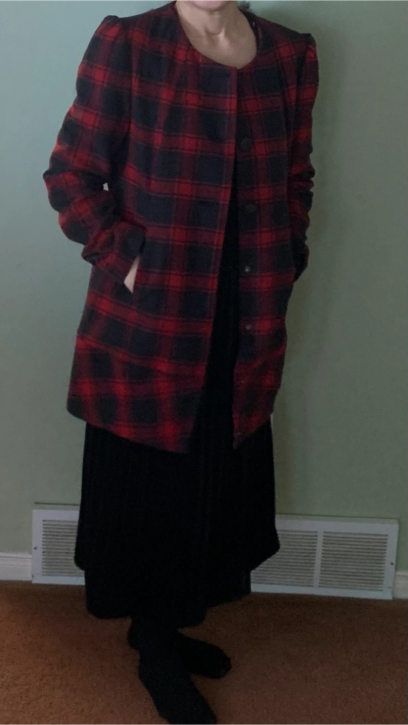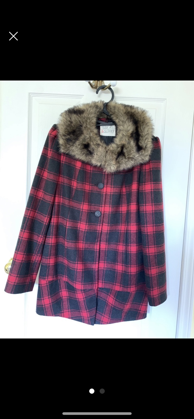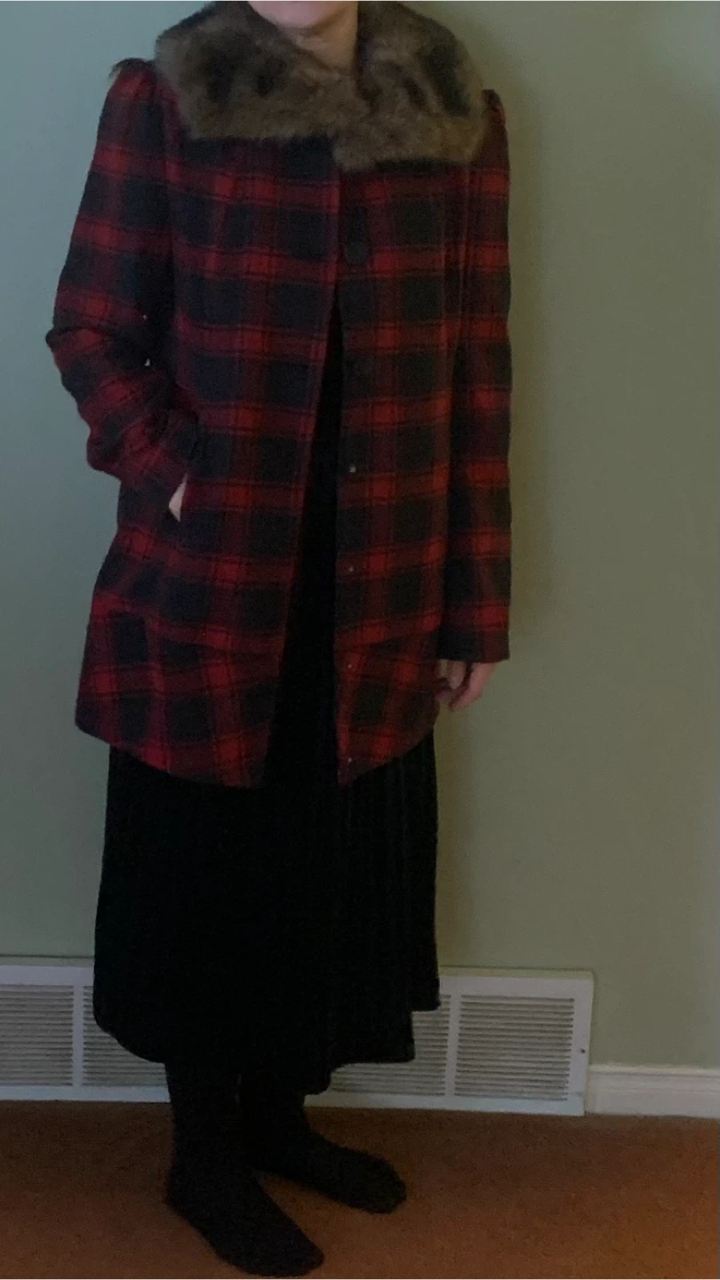 Red and Black Plaid wool Coat with Faux Fur Collar. New