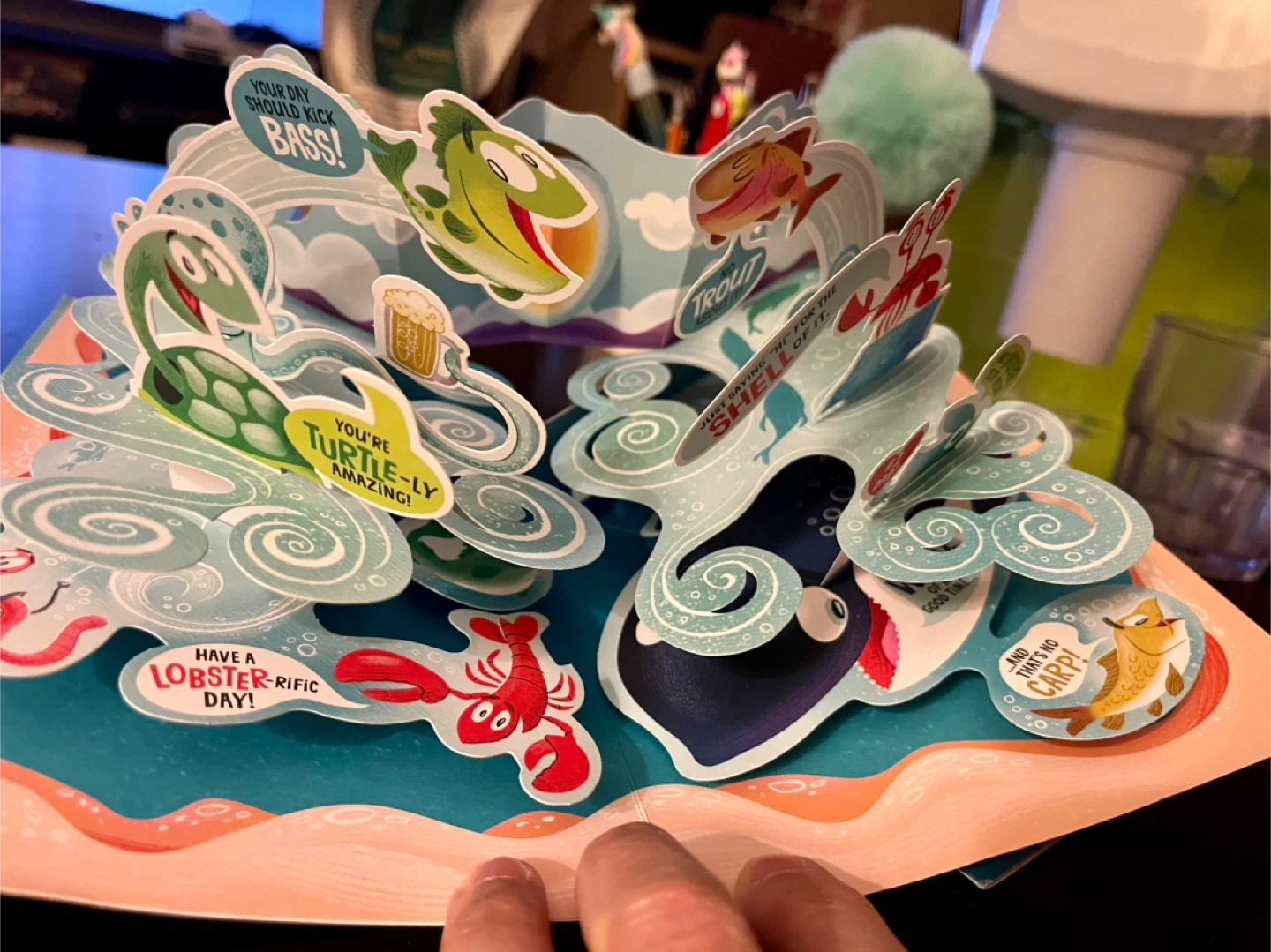 This is a Hallmark pop-up card that reads "You're a Great Dad! So, just for you...". The inside features fun sea creatures and puns like "Have a LOBSTER-RIFIC DAY!" and "You're TURTLE-LY amazing!". It's a fantastic way to show appreciation for Dad!