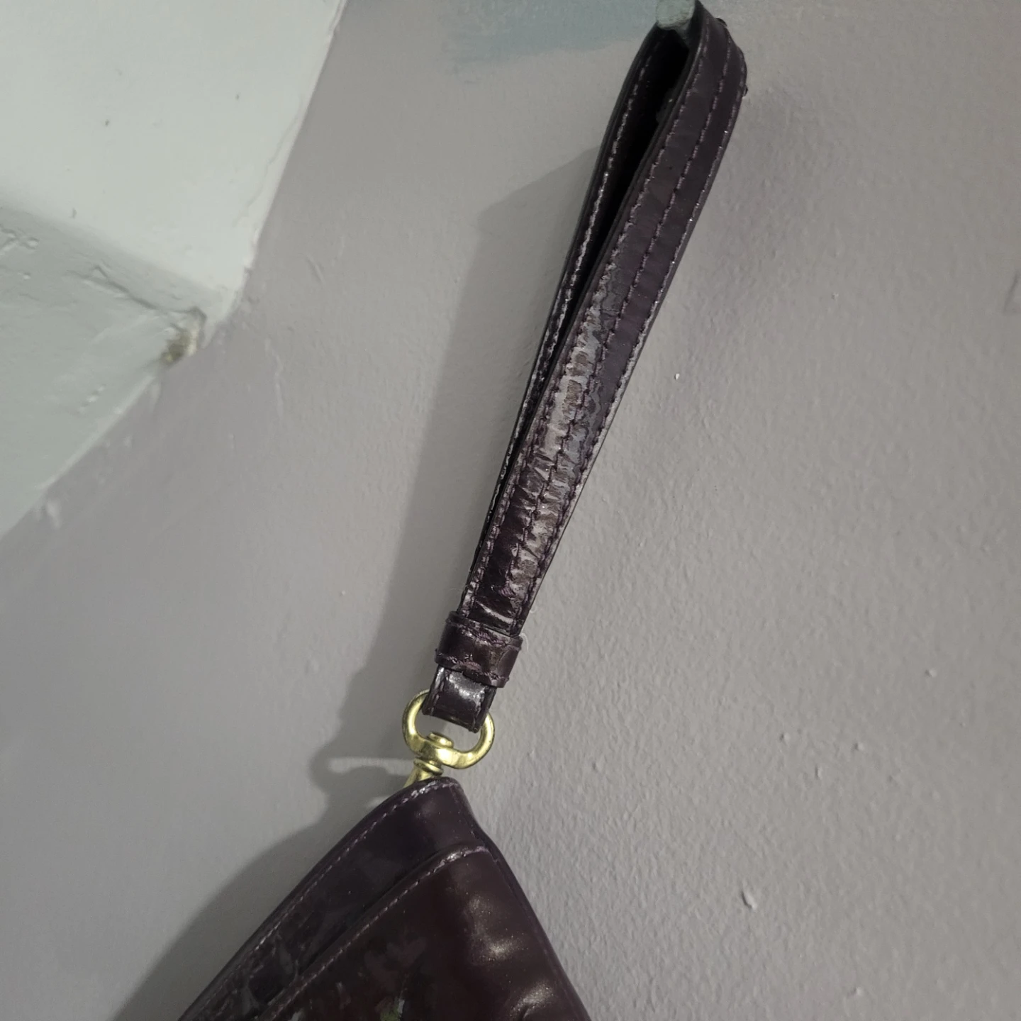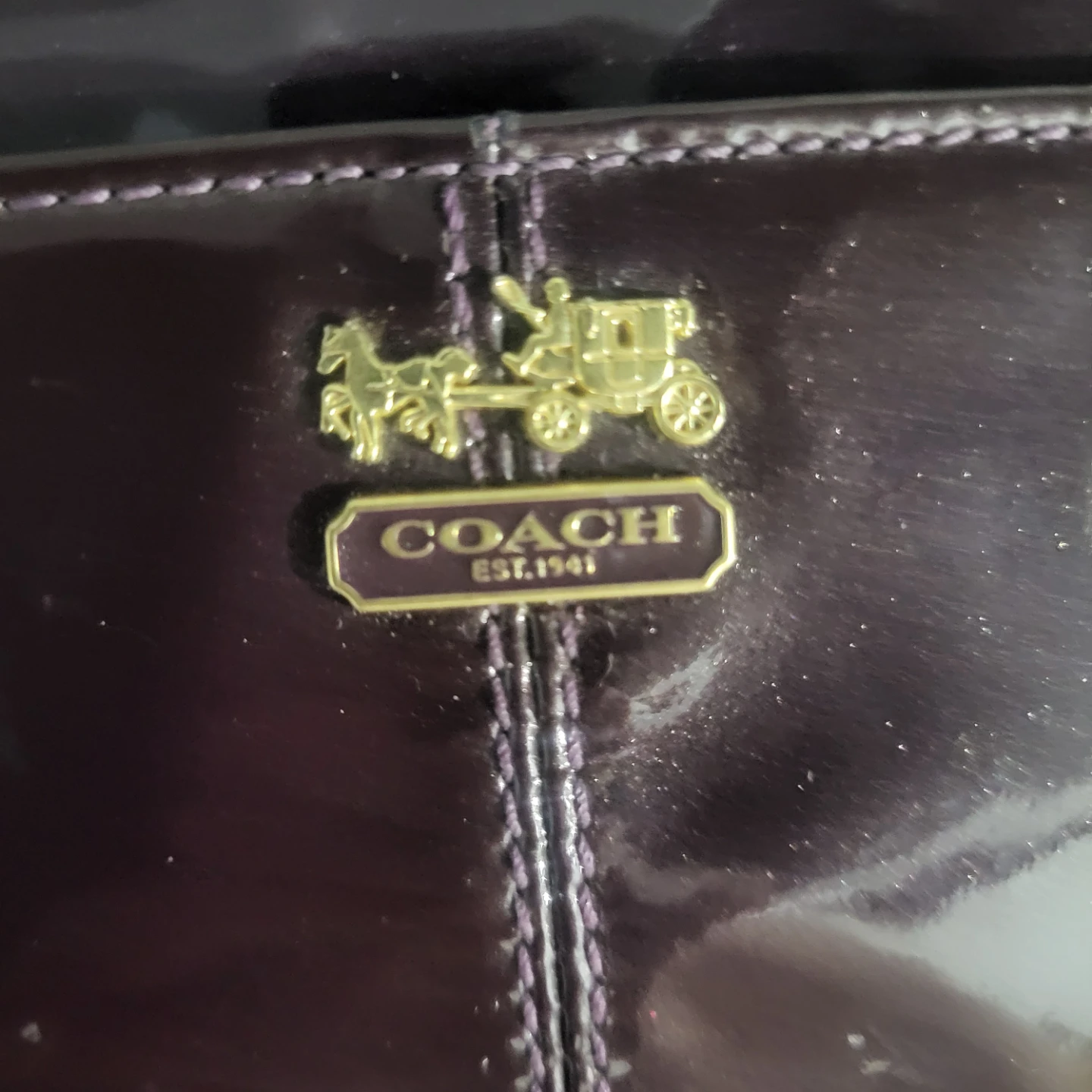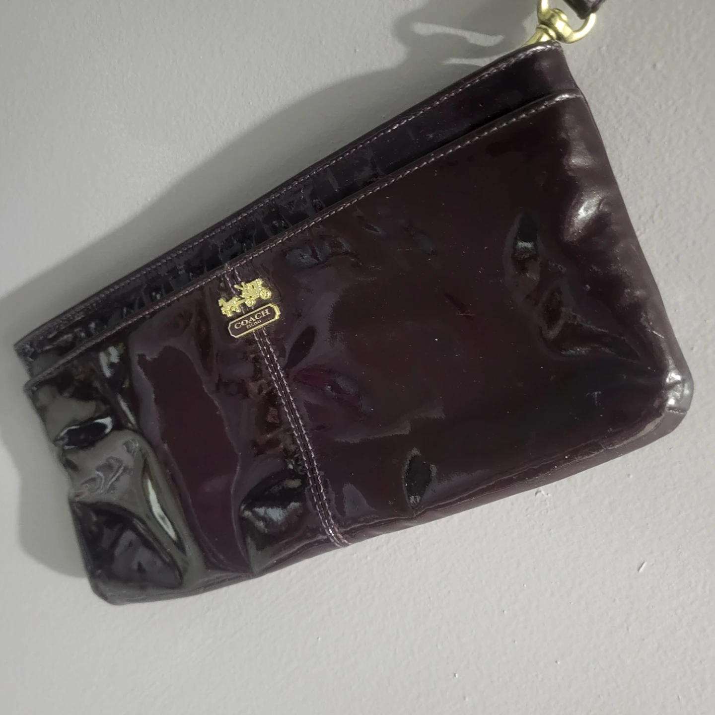 This is a Coach patent leather wristlet pouch. It's a dark plum colour and has a wrist strap. Multiple card slots are inside.