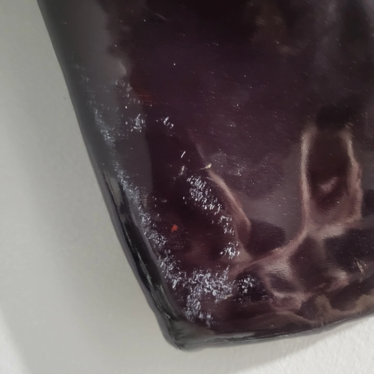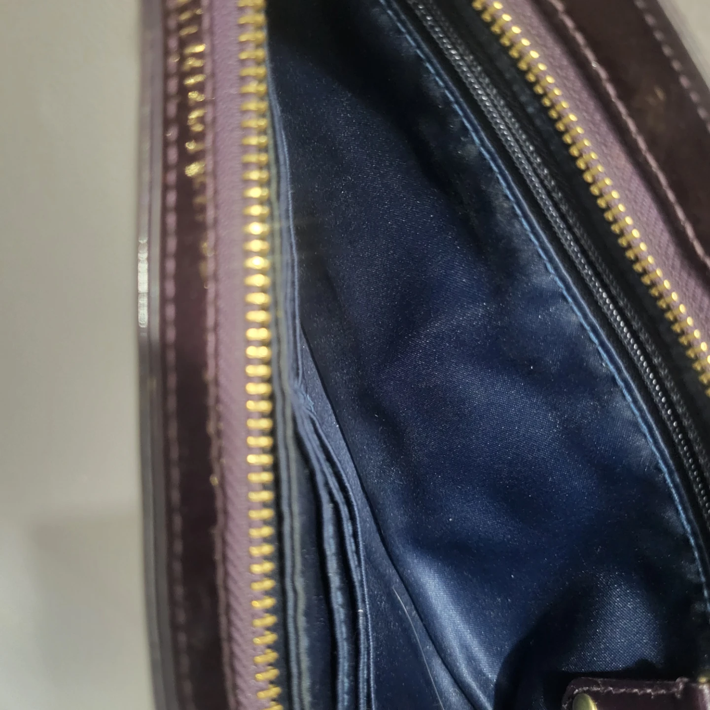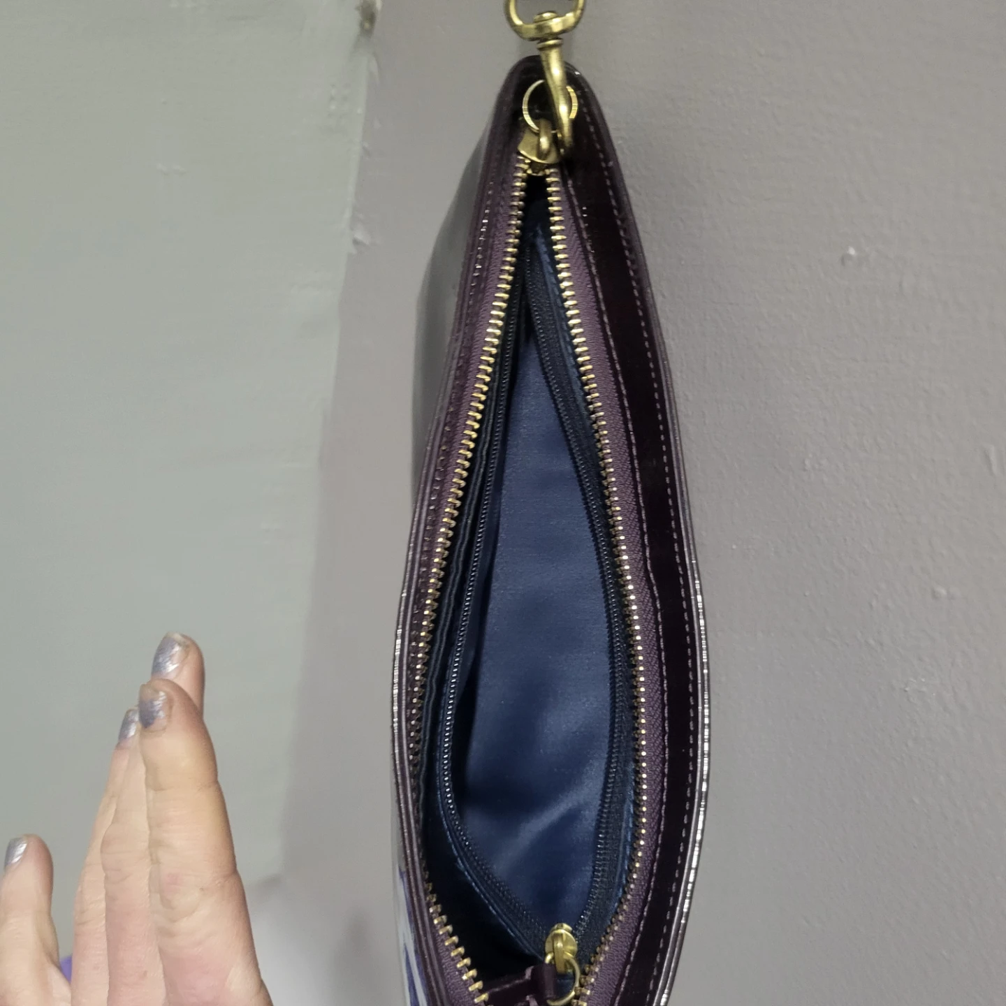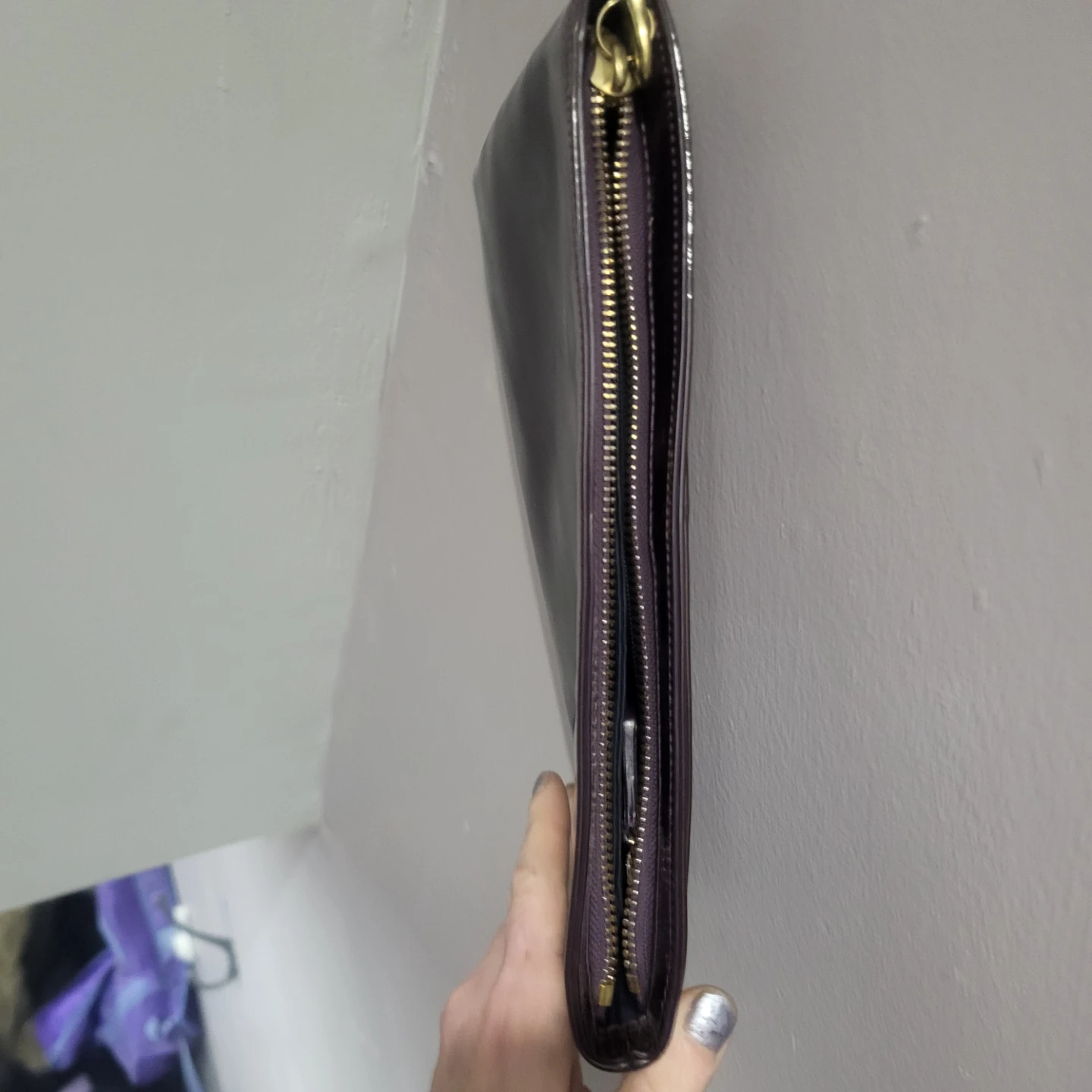 This is a Coach patent leather wristlet pouch. It's a dark plum colour and has a wrist strap. Multiple card slots are inside.