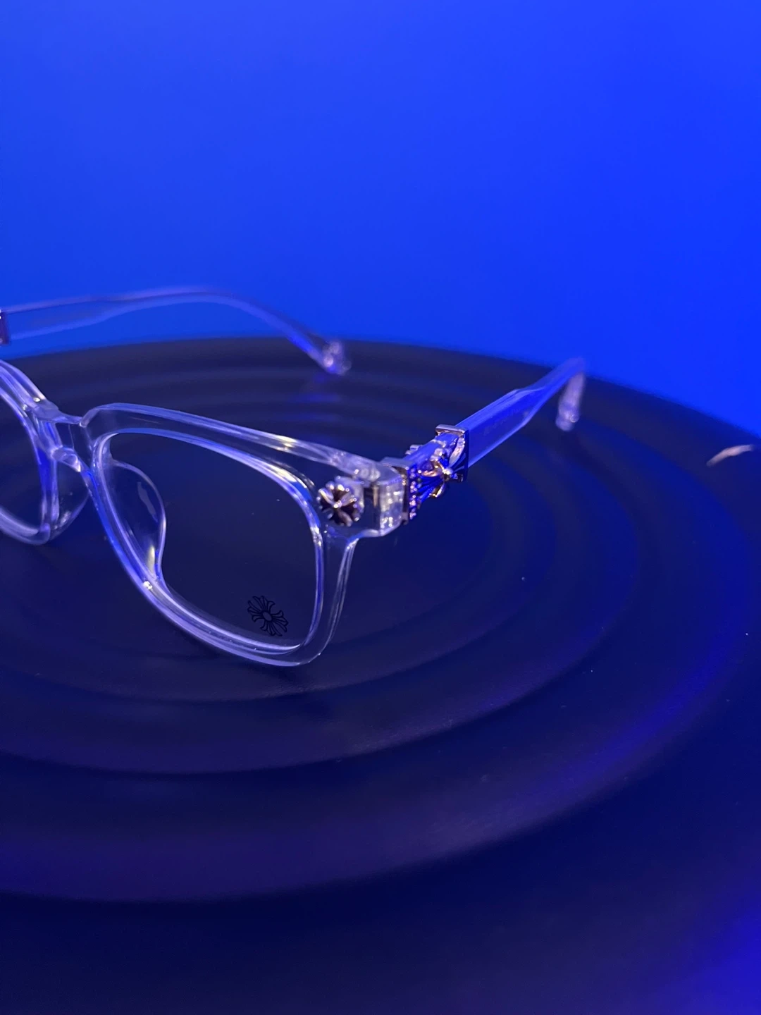 Clear acetate optical frames with decorative embellishments on the temples. Includes original protective bag.