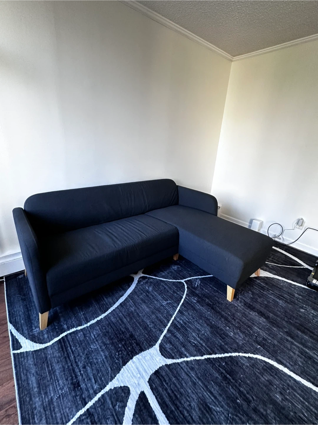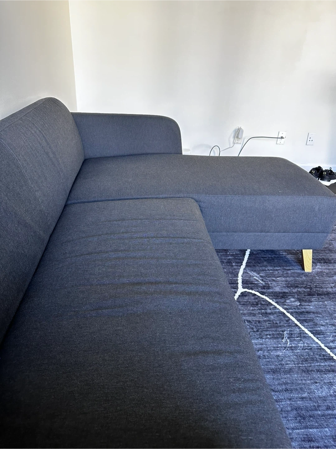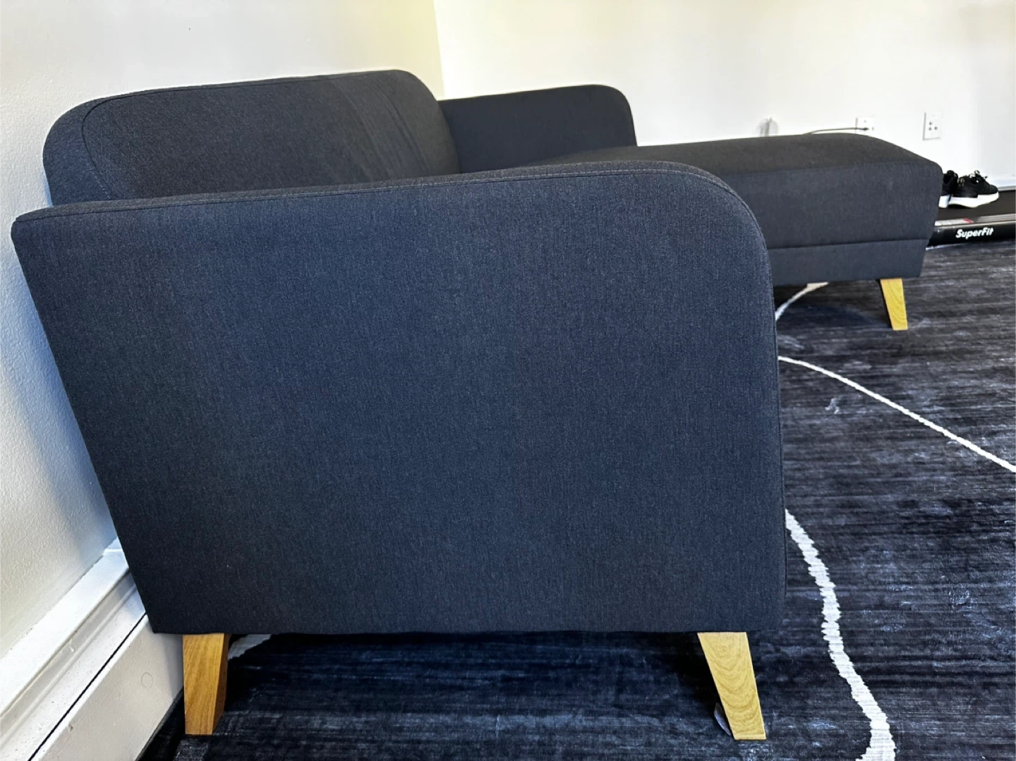 This dark grey sectional sofa features a chaise, perfect for stretching out. Its fabric upholstery and wooden legs offer a modern look. It's a great addition to a living room or apartment space!
