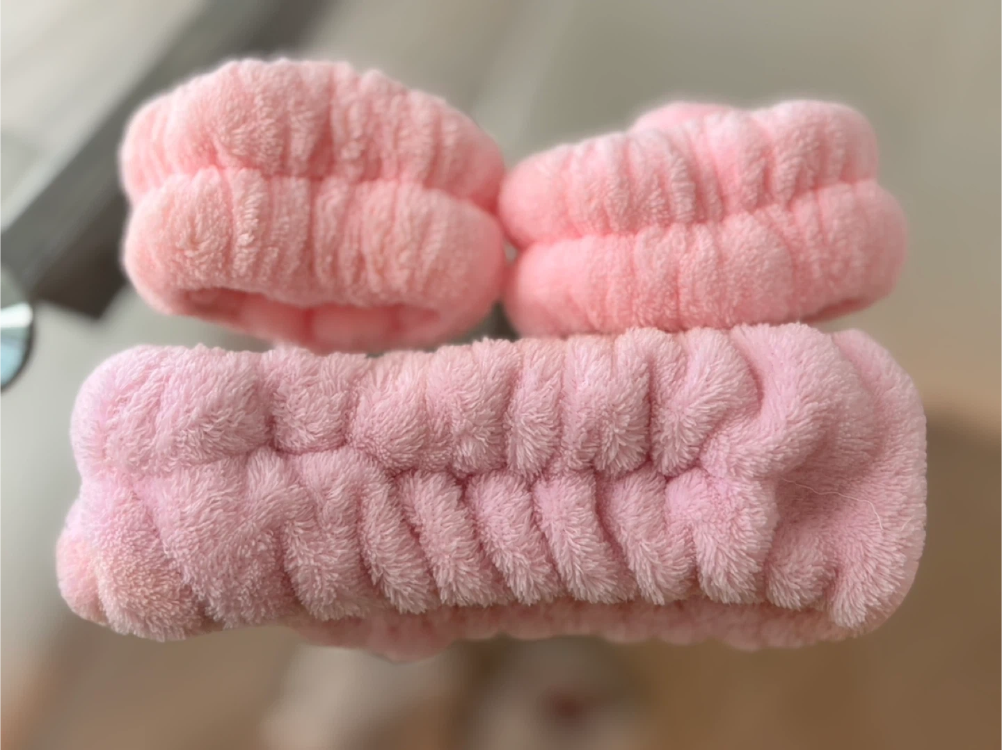 This is a set of pink fluffy beauty headbands and wrist cuffs. They're made of soft, plush material and are elasticized for a comfortable fit. Keep your hair back and water off your arms during your skincare routine!