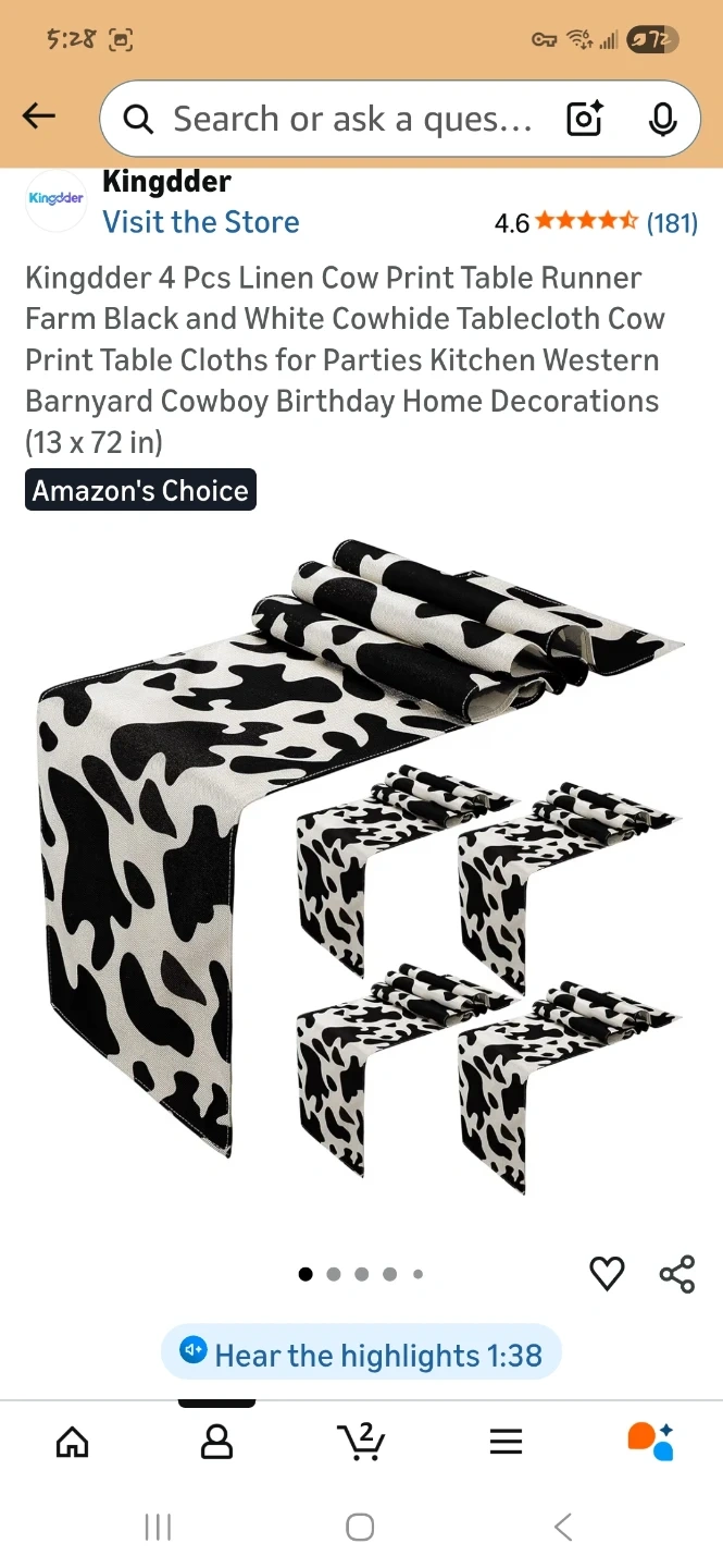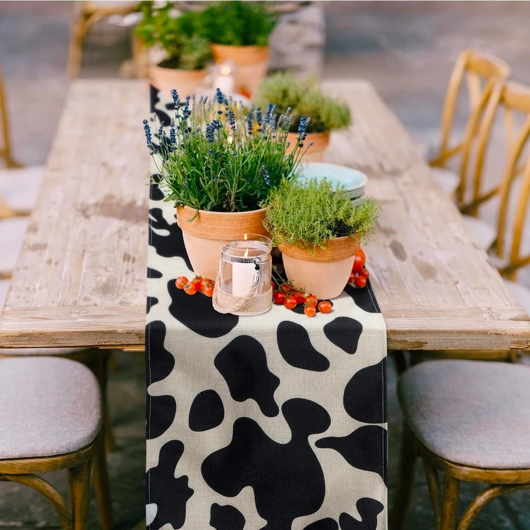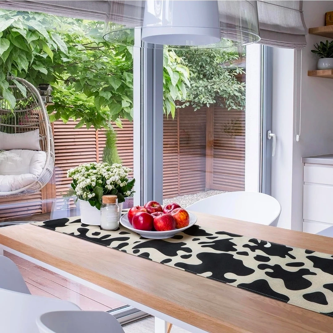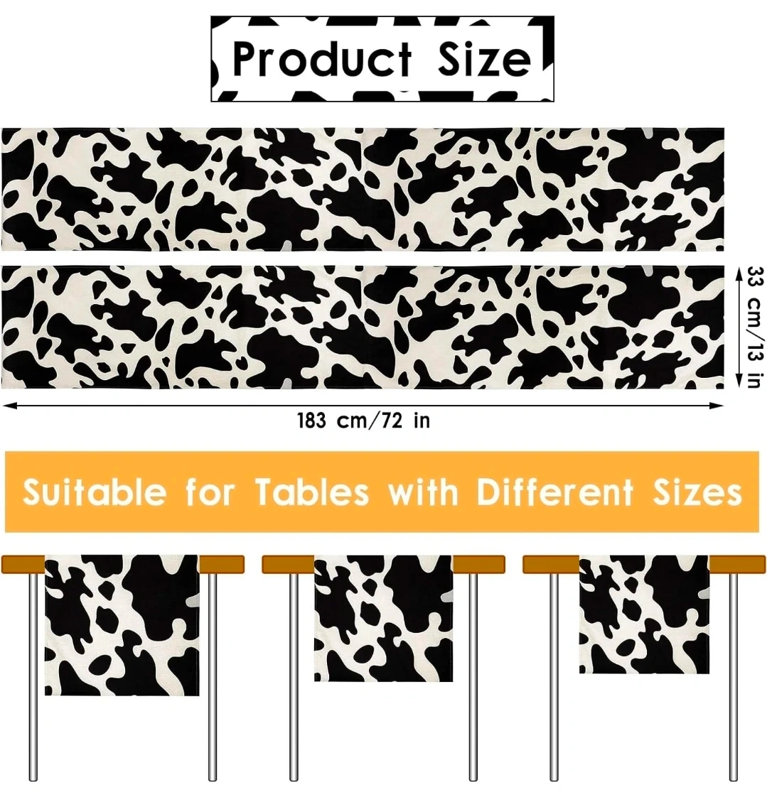 This table runner showcases a fun cow print design. It's made from durable, soft material that's easy to iron at low temperatures and offers natural environmental protection. The runner measures 183 cm (72 inches) long and 33 cm (13 inches) wide, fitting tables of various sizes.