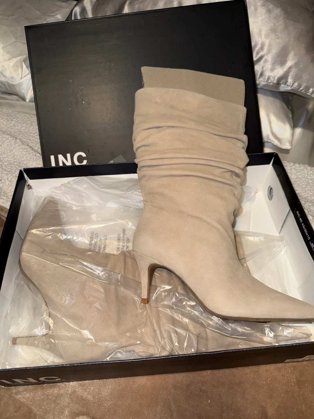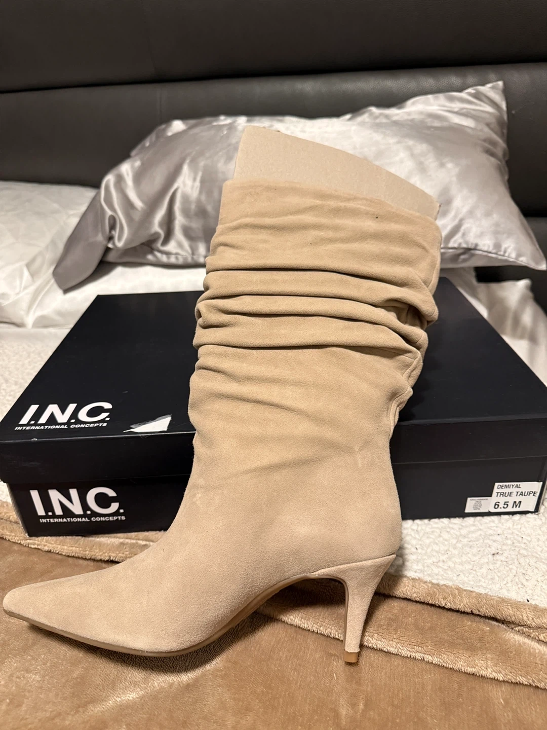 Brand new INC International Concepts "DEMYTA" slouch boots. Comes in a beautiful True Taupe color. Size 6.5 M. Boots are in their original box and packaging.