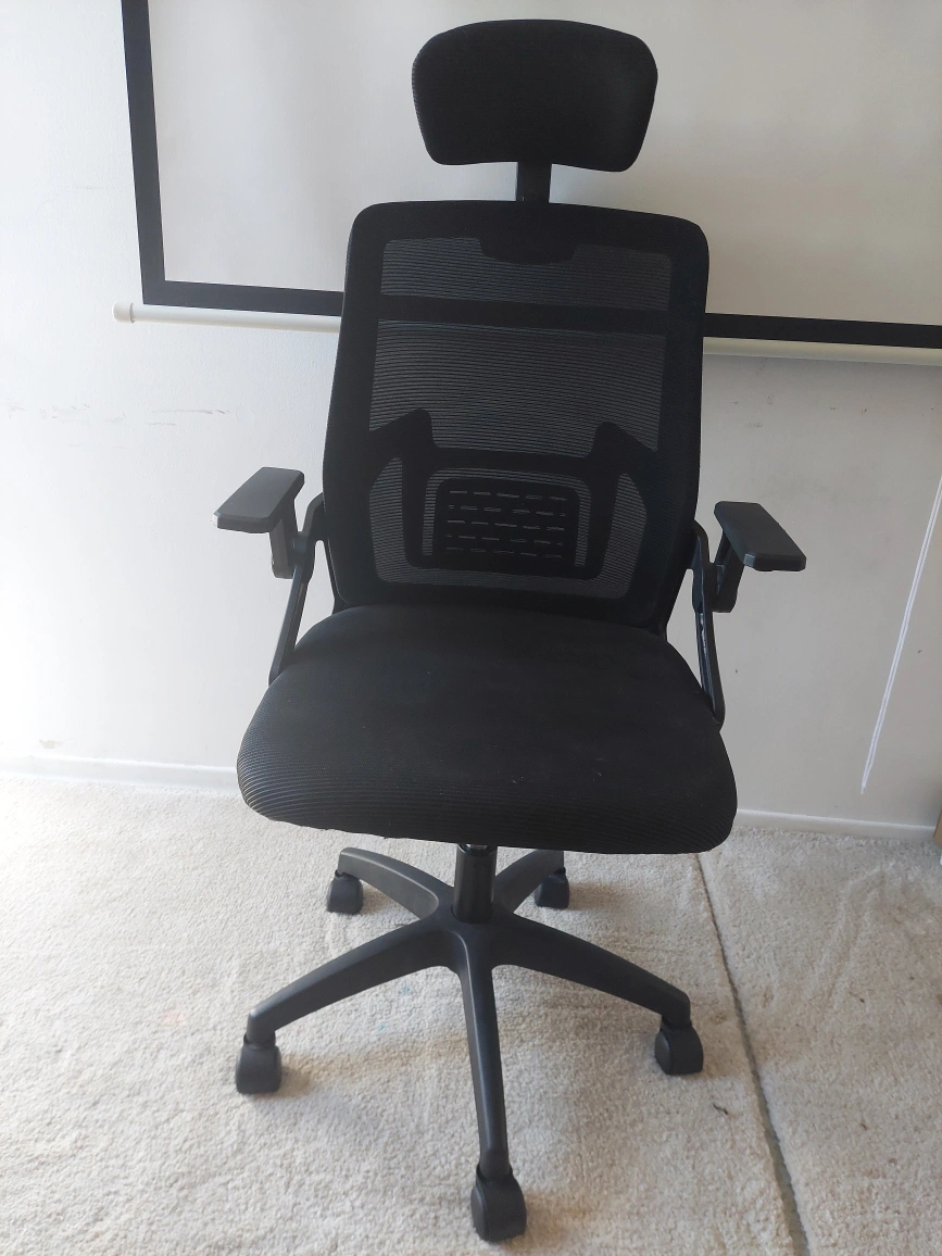 Ergonomic Black mesh revolving office chair with headrest and adjustable armrests.
