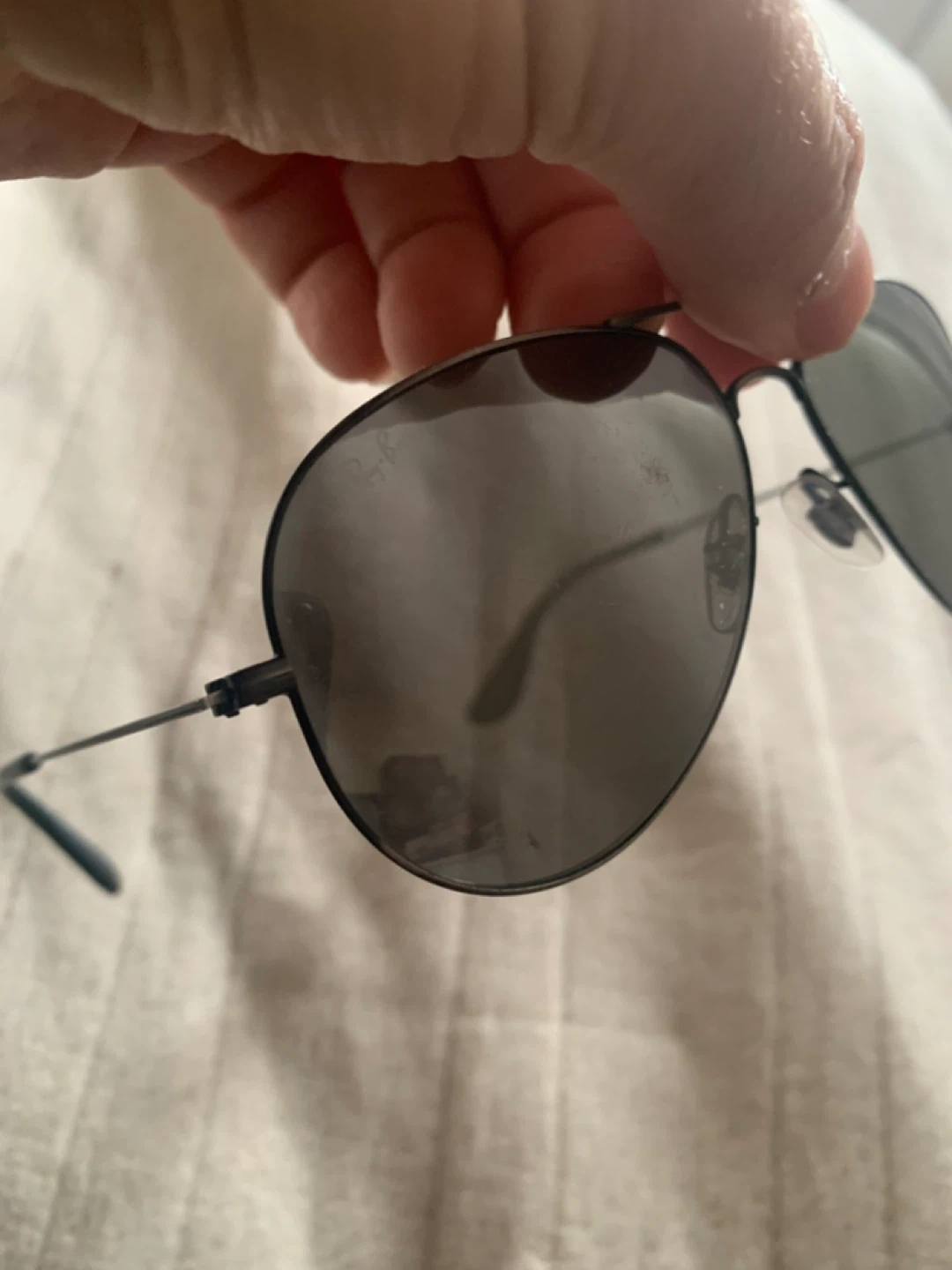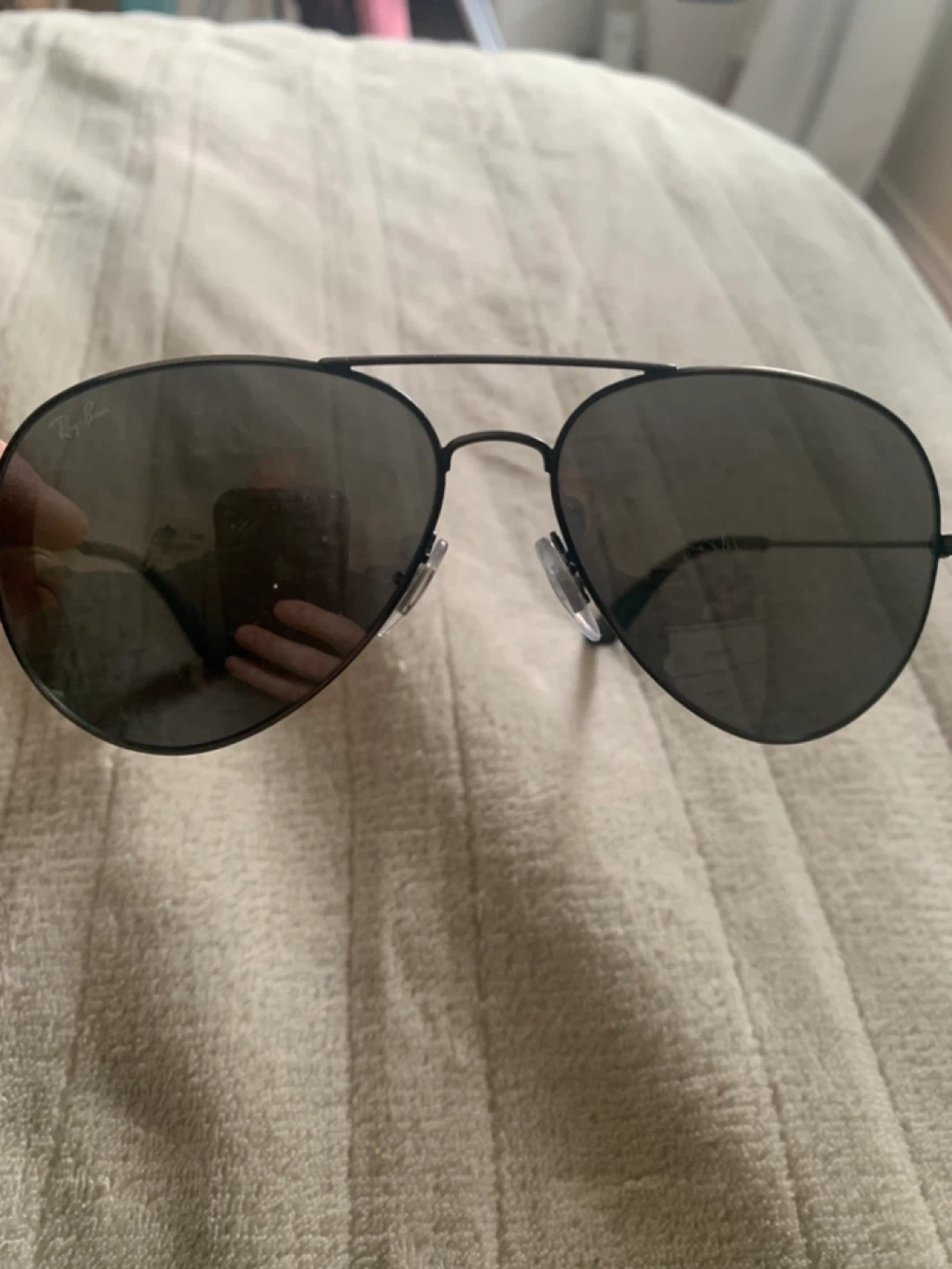 These Ray-Ban aviator sunglasses feature a polished black frame and black polarized lenses. They come with adjustable nosepads for a comfortable fit. These shades offer classic style and sun protection.some minor scratches on the lenses