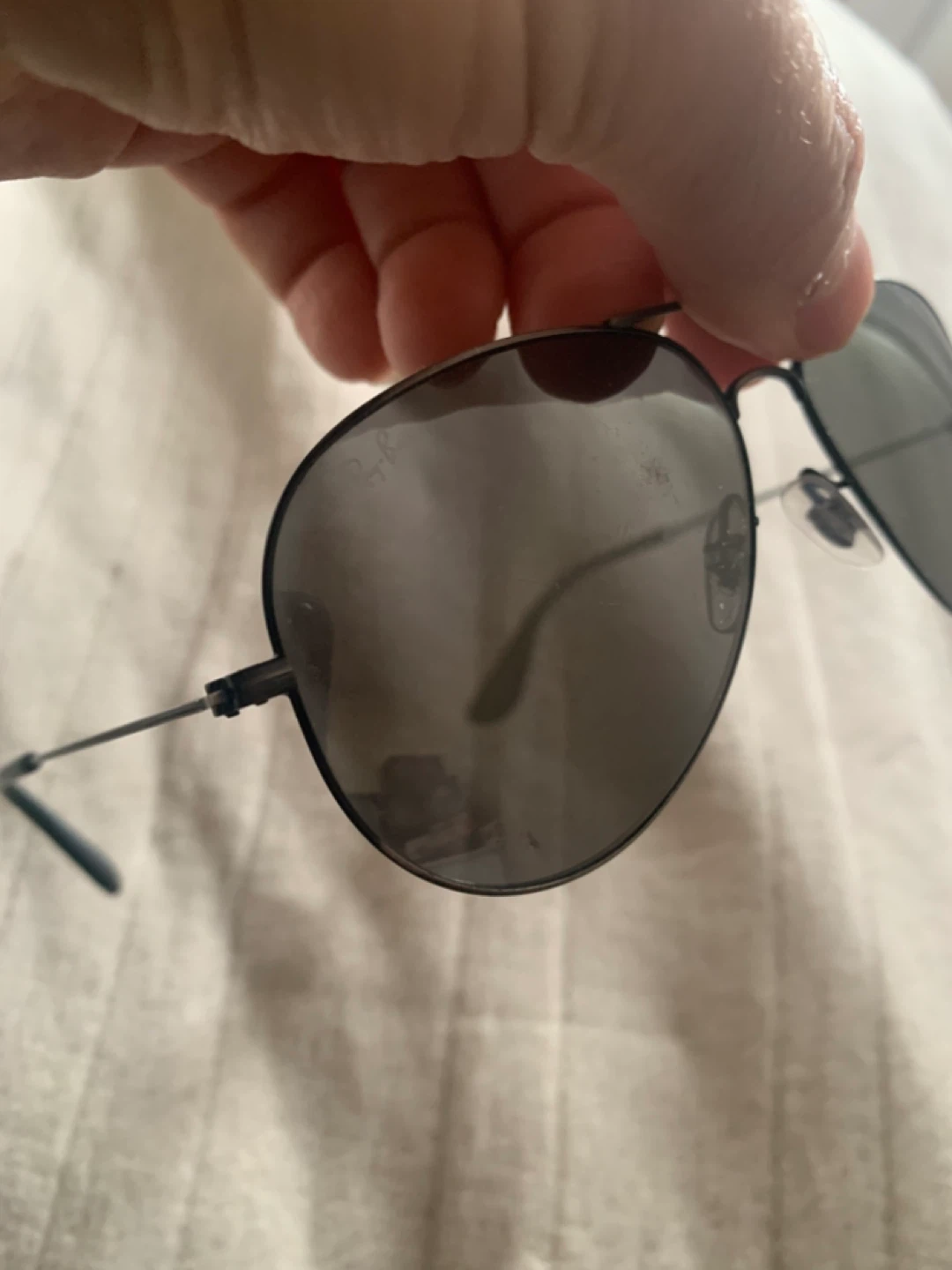 These Ray-Ban aviator sunglasses feature a polished black frame and black polarized lenses. They come with adjustable nosepads for a comfortable fit. These shades offer classic style and sun protection.some minor scratches on the lenses