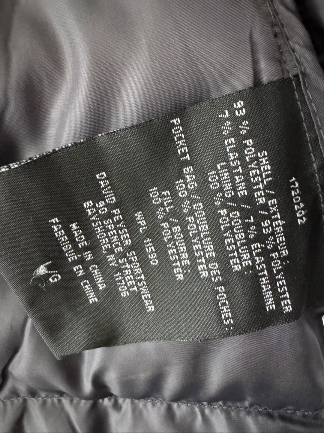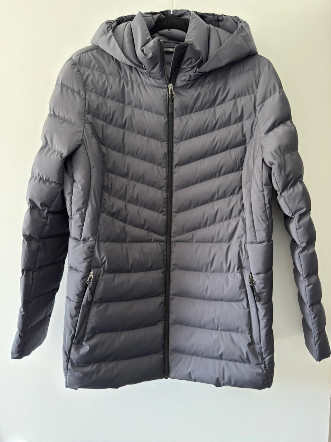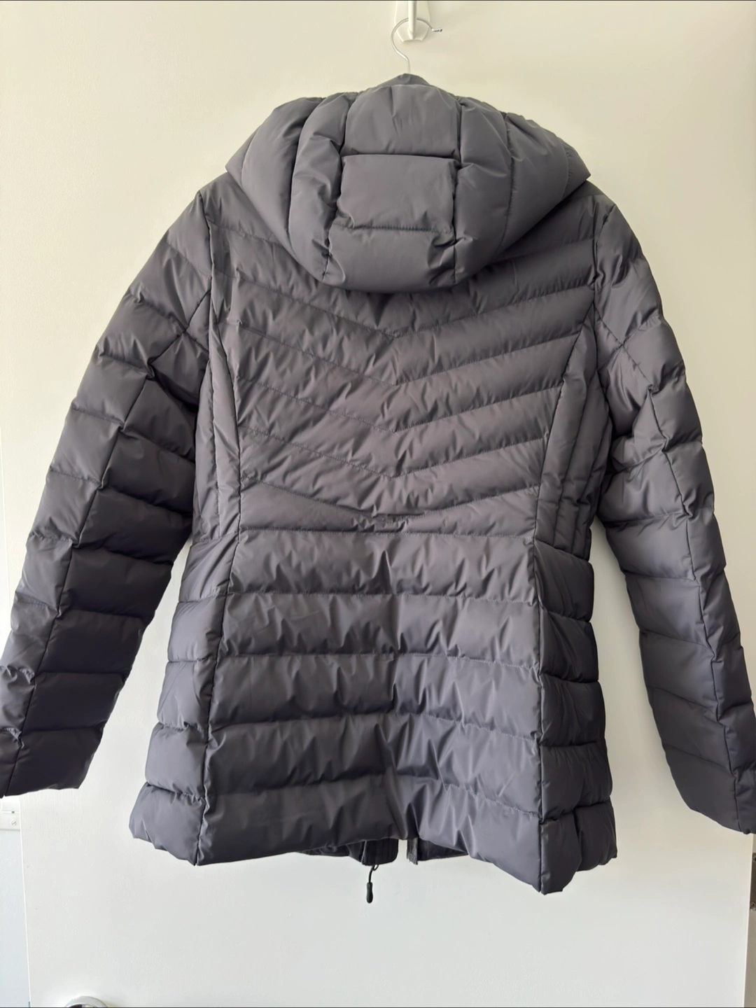 71Women's dark grey puffer jacket. Features a hood and zip closure. Size large. Never used.