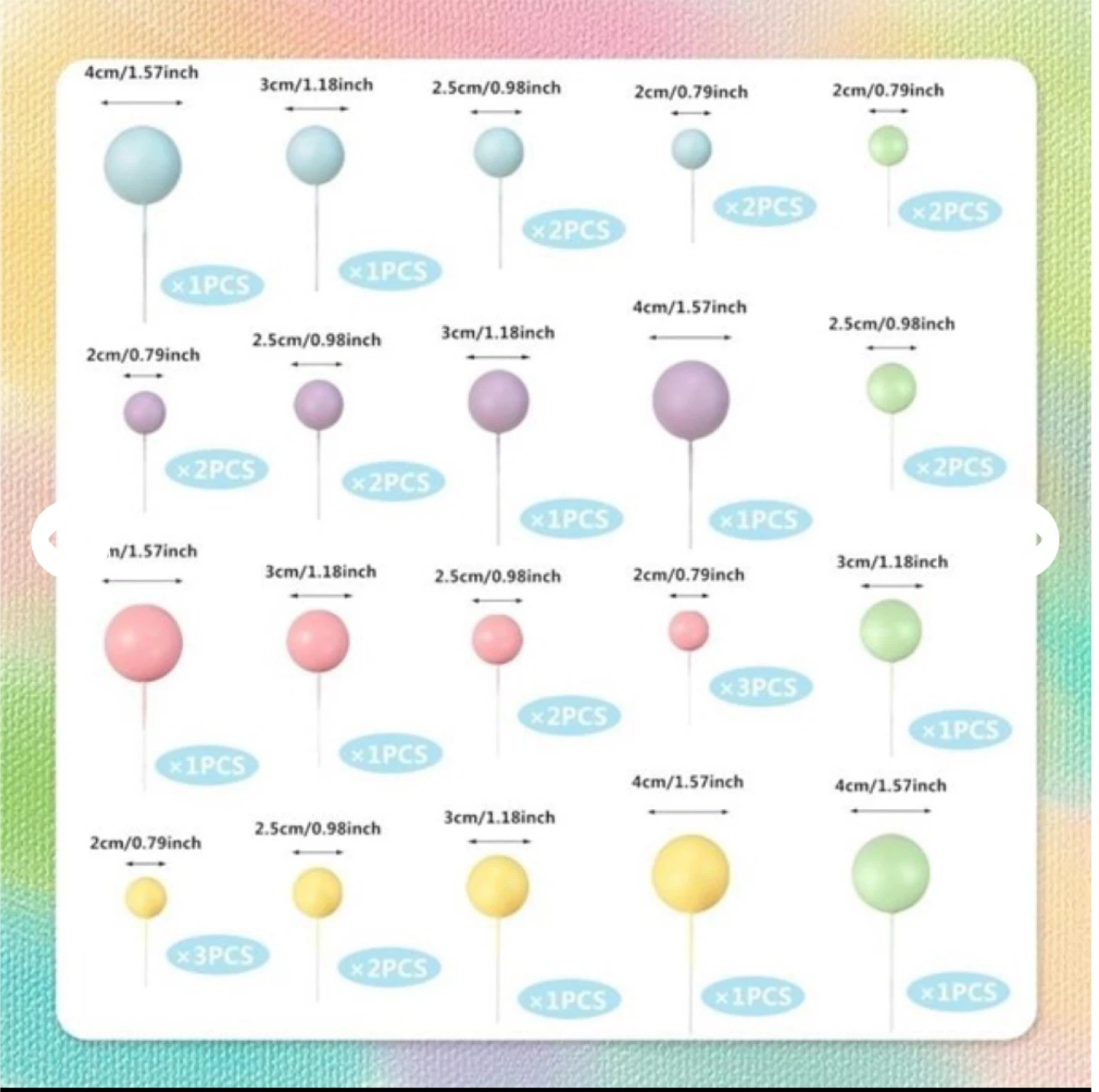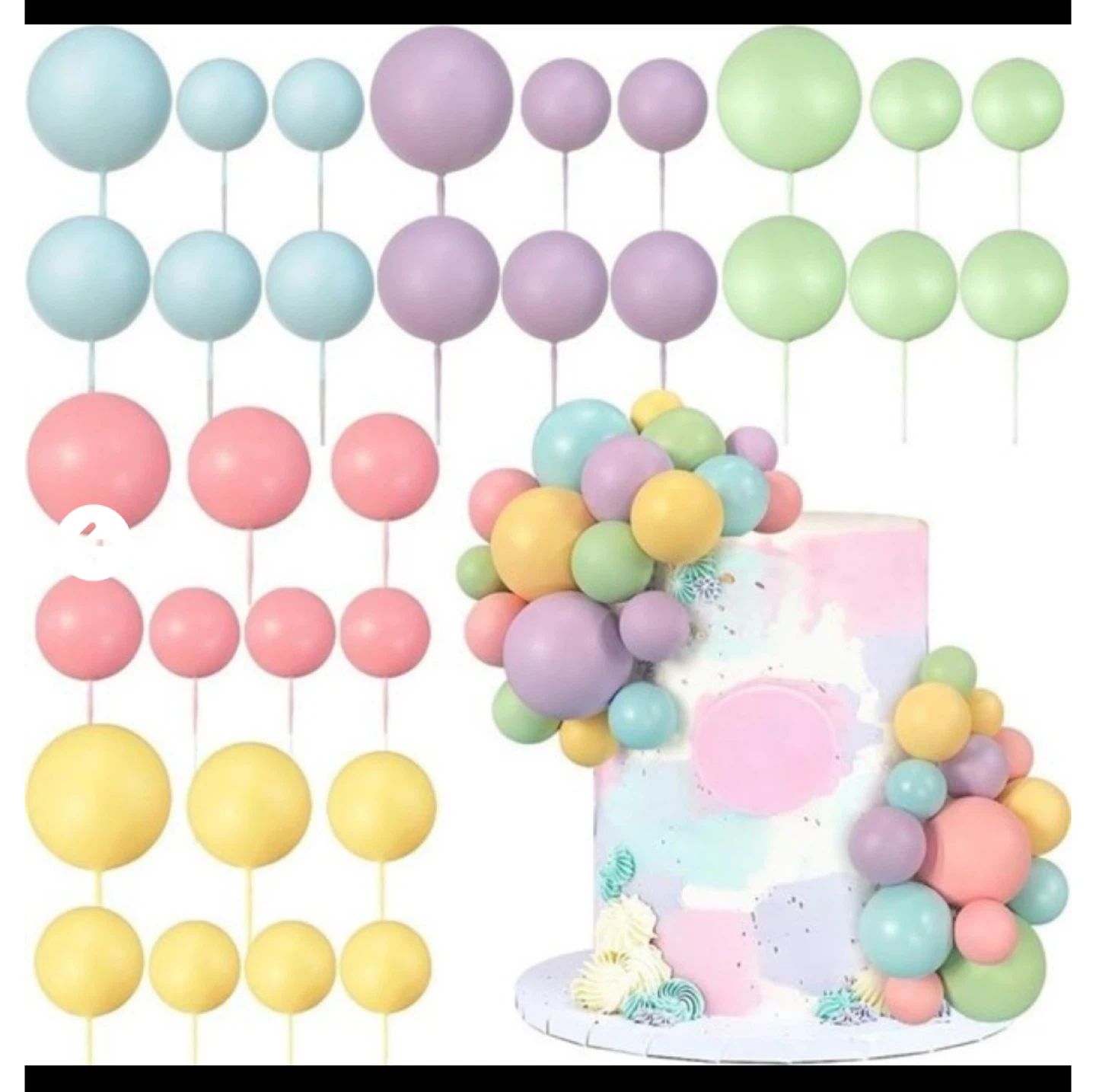 Add a touch of whimsy to your cakes with this adorable cake topper ball set! It comes in a variety of pastel colours, including blue, purple, pink, green, and yellow. Sizes range from 2cm/0.79inch to 4cm/1.57inch. Perfect for birthday cakes, baby showers, or any special occasion