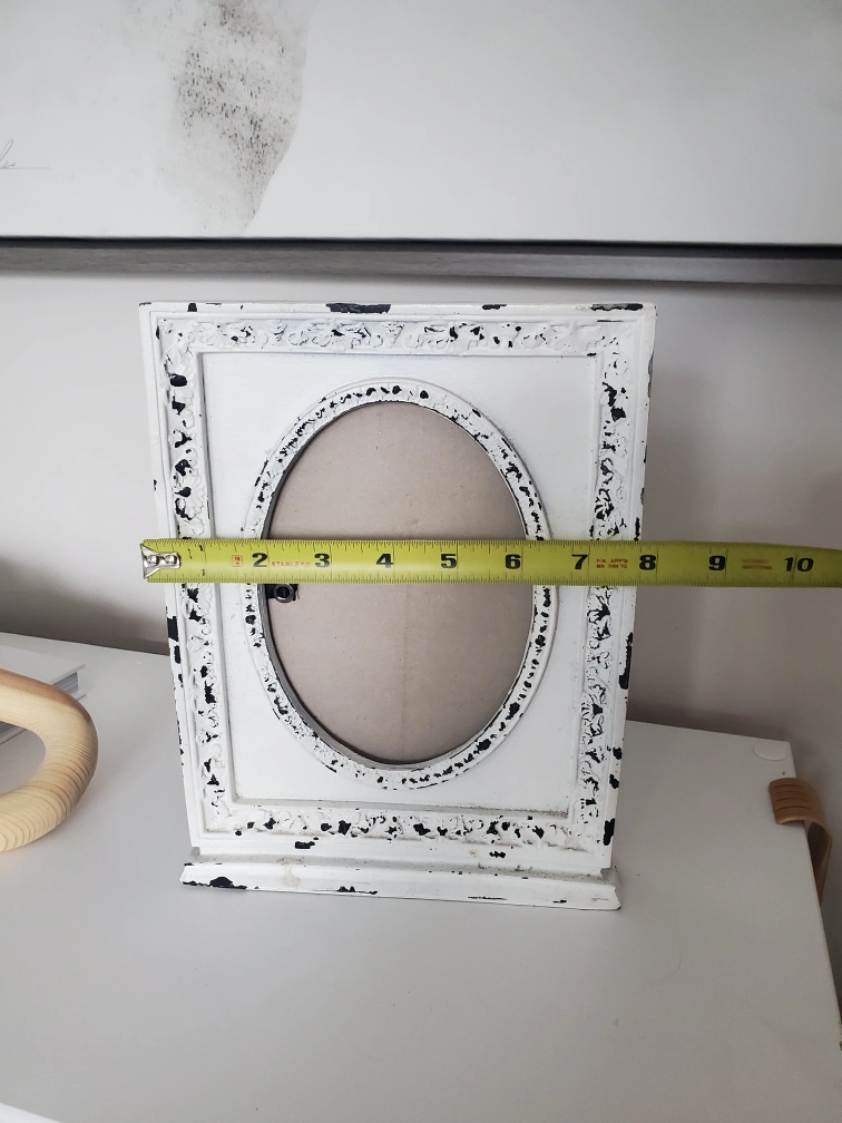 This is a white picture frame with a distressed look. It is approximately 9" tall and 6.5" wide. The opening for a photo is an oval and measures approximately 5" tall and 4" wide. The back comes off to allow for easy insertion of your photos.