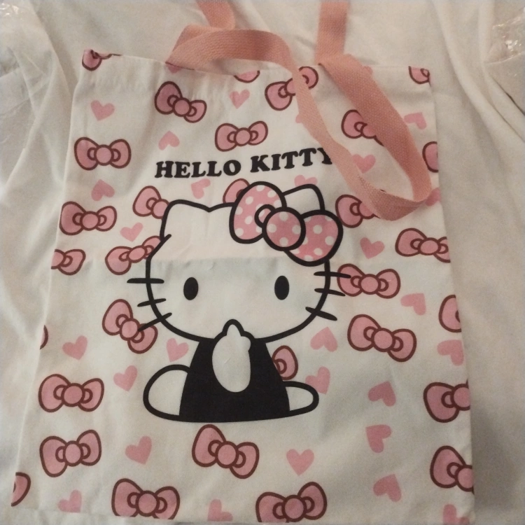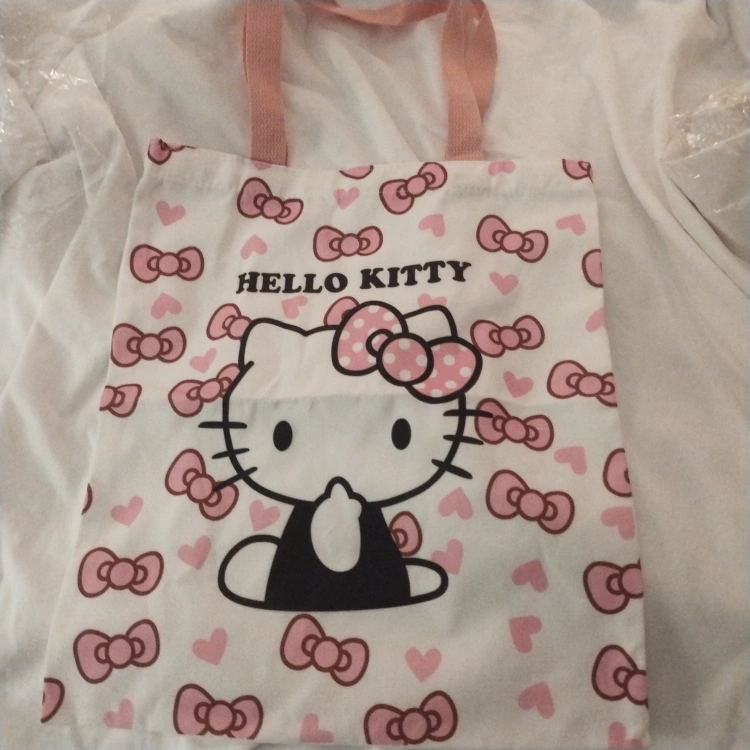 123A white tote bag with Hello Kitty on the front. It has pink bows and hearts printed on it. The straps are pink.
