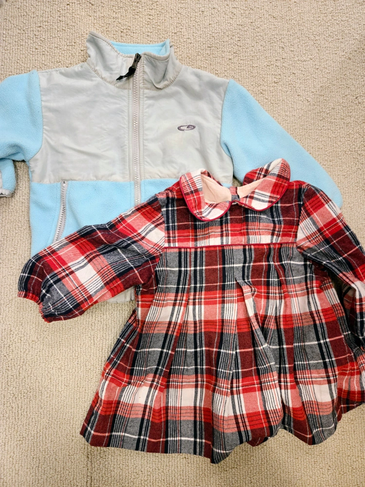 Red and black plaid dress and blue fleece jacket. The dress has a Peter Pan collar and long sleeves. The jacket has a zipper closure and pockets. Great for layering in colder weather.