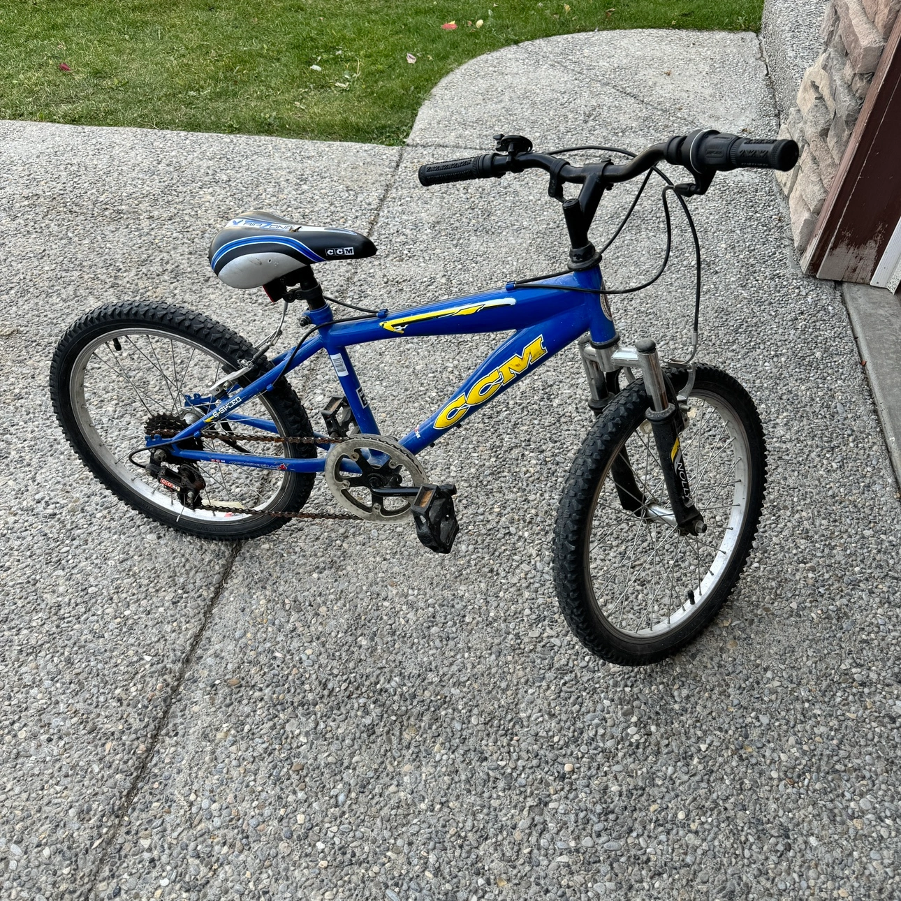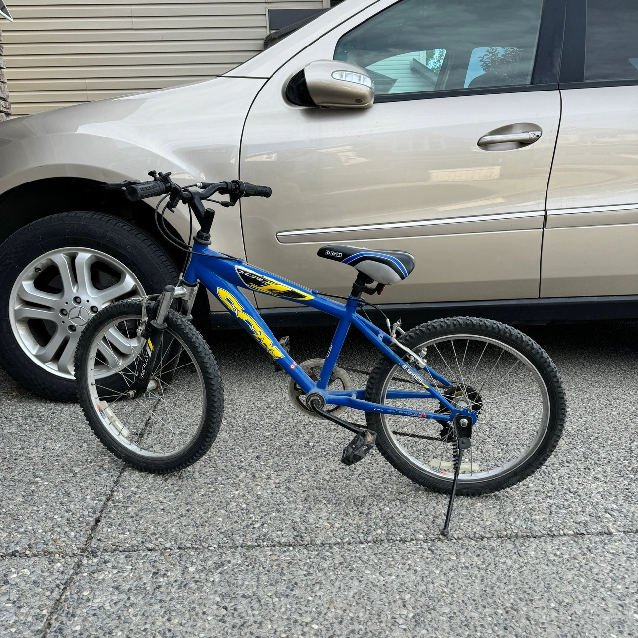 Blue and yellow CCM bicycle. Has kickstand. It is in good condition just a tear on the seat.