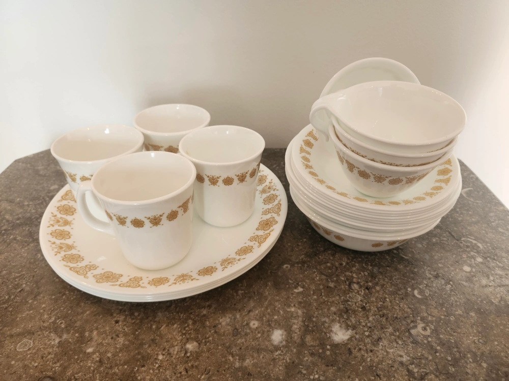 Buy & SellCorelle "Butterfly Gold" 24 Piece SetCorelle "Butterfly Gold" 24 Piece Set$40Set includes 4 of each: plate, small plate, bowl, mug, cup and saucers one mug has staining- see picture good condition, smoke and pet free homeConditionGoodWHERE TO MEETshops at don millsView MapSELLERverifiedemDon Mills1218 reviews4 chats·4 favorites·139 views