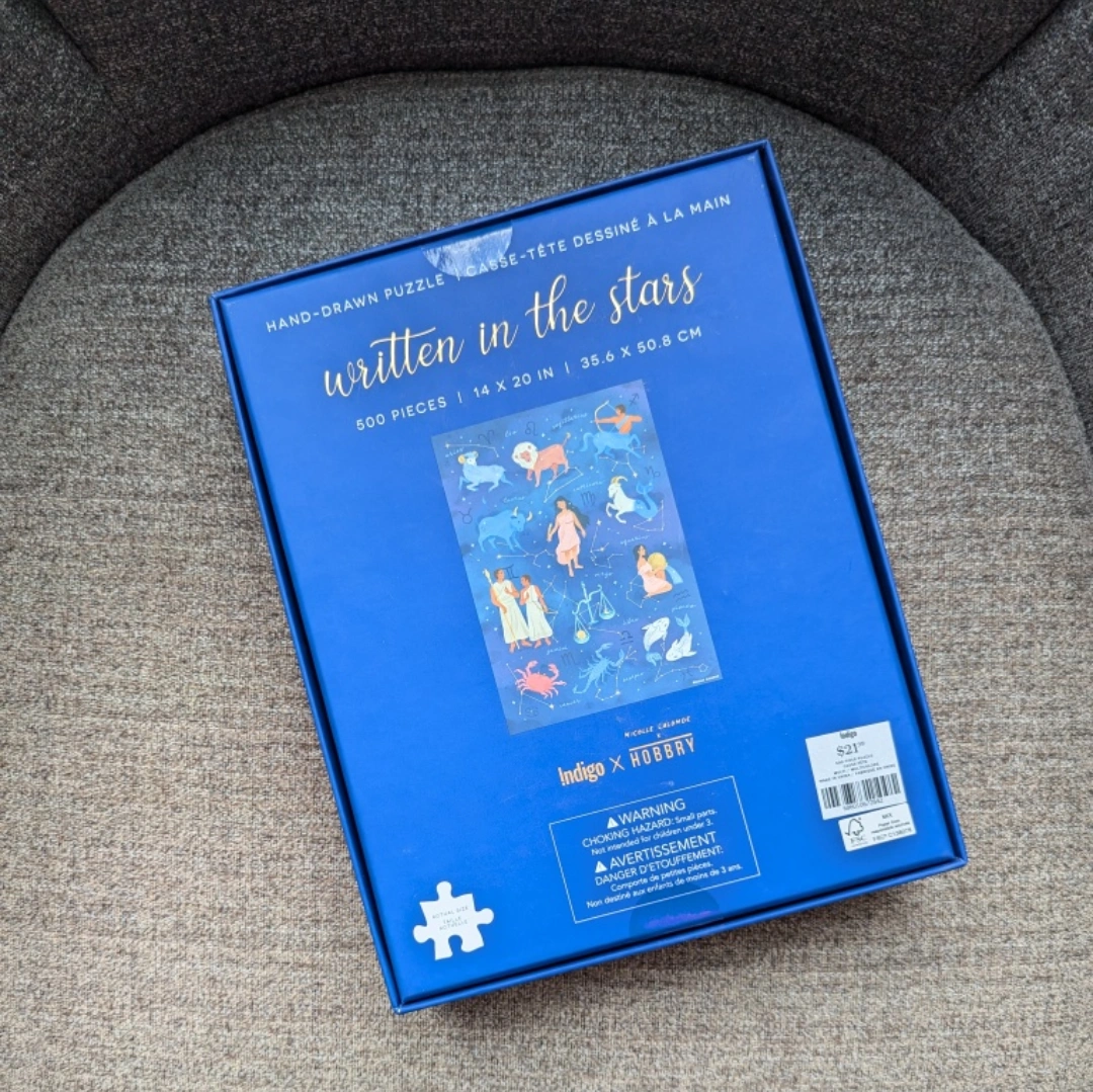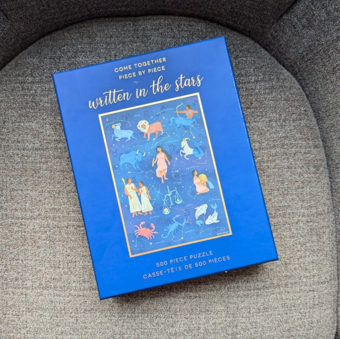 A 500-piece jigsaw puzzle featuring the zodiac constellations and a night sky background. The box is in good condition as well. It is great for puzzle enthusiasts or astrology lovers.