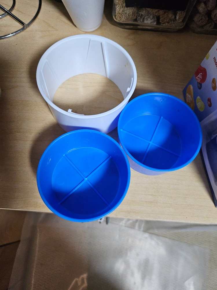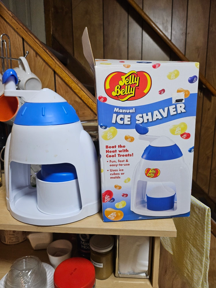 This is a manual ice shaver with a blue and white design. It has a handle for hand cranking to shave the ice. Includes original box and a few extra parts and 2 cups for shaved ice. This is ideal for adding ice for your dessert. enjoy